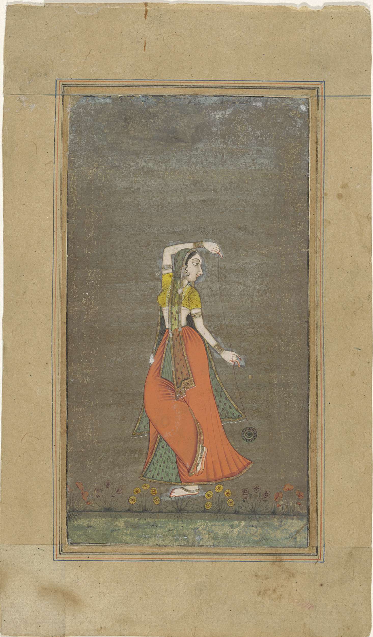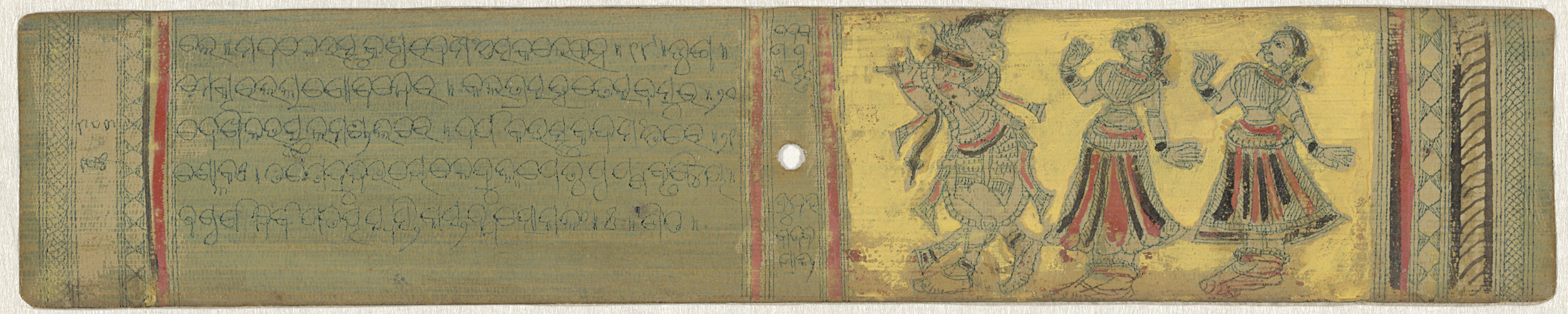 Fluitspelende figuur en twee dansende vrouwen