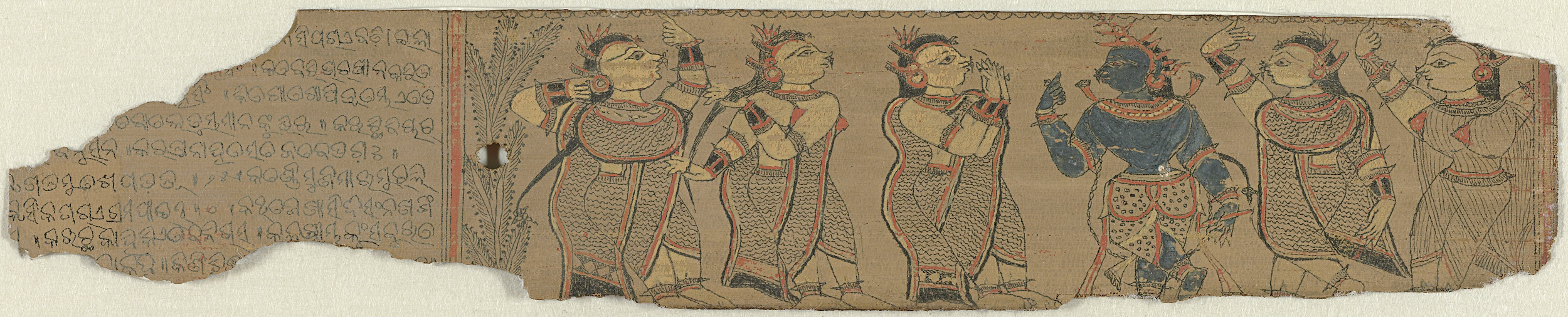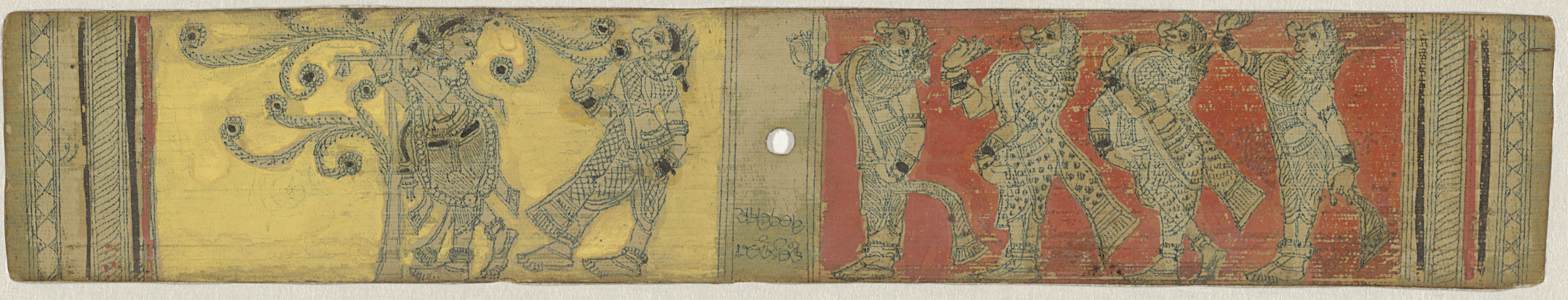 Links een fluitspelende figuur tegenover een dansend...