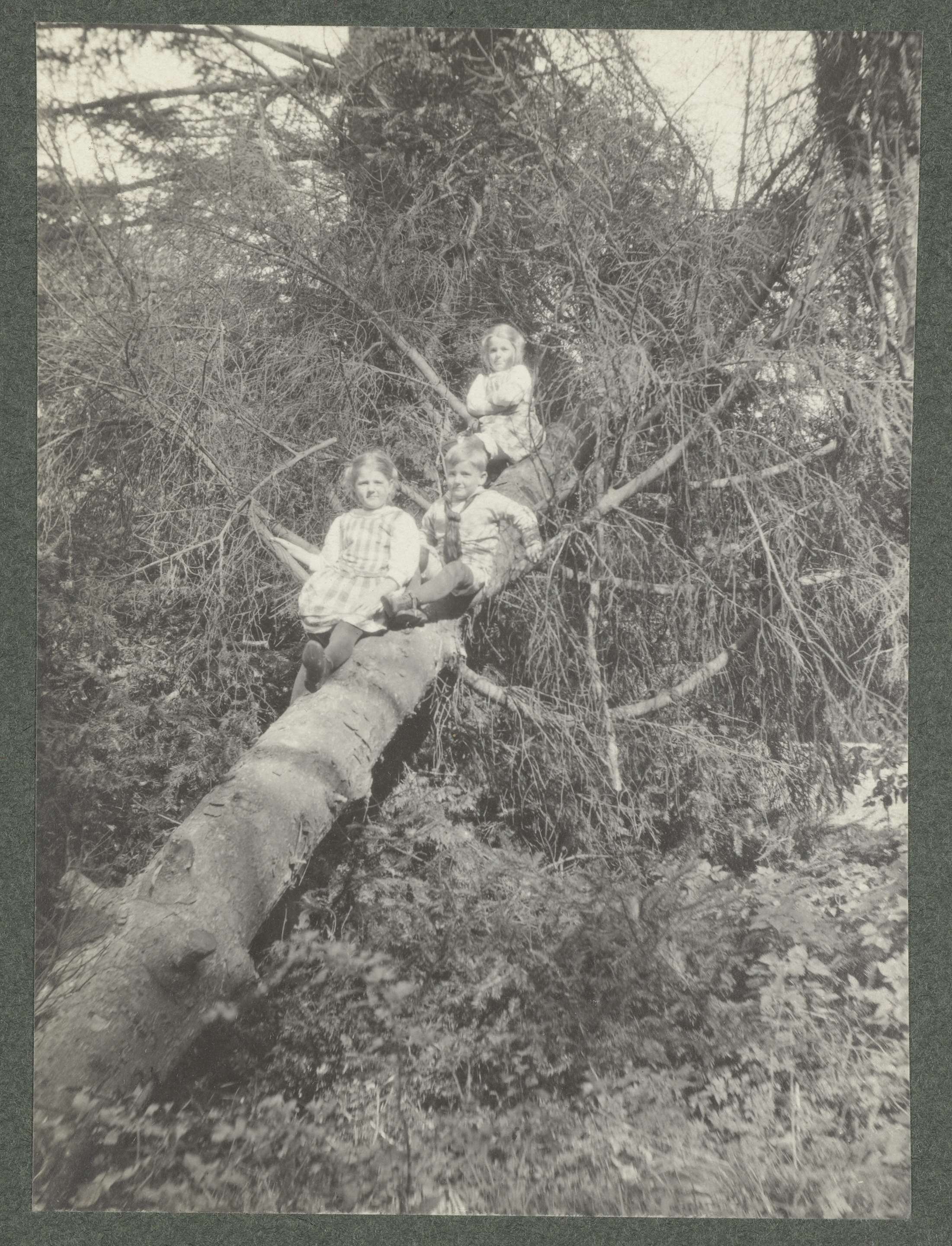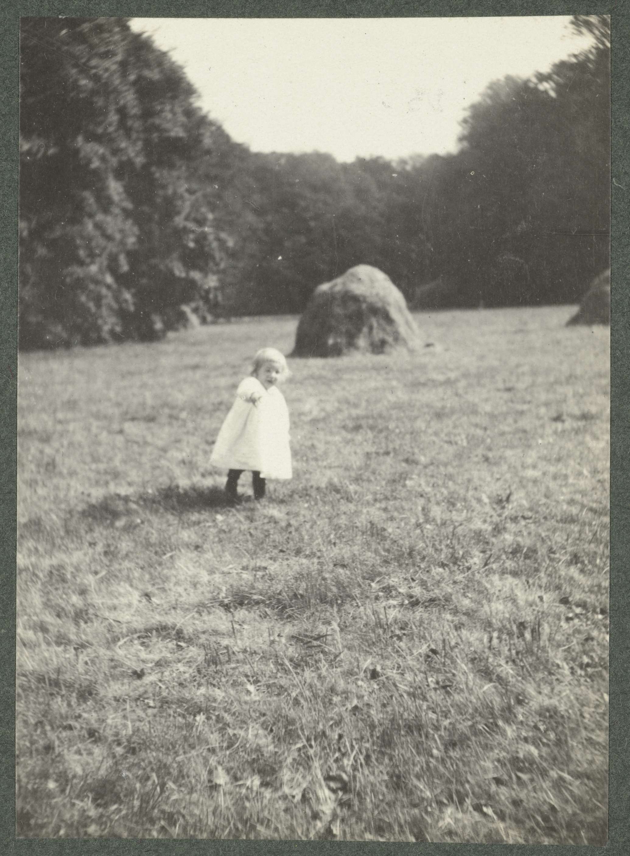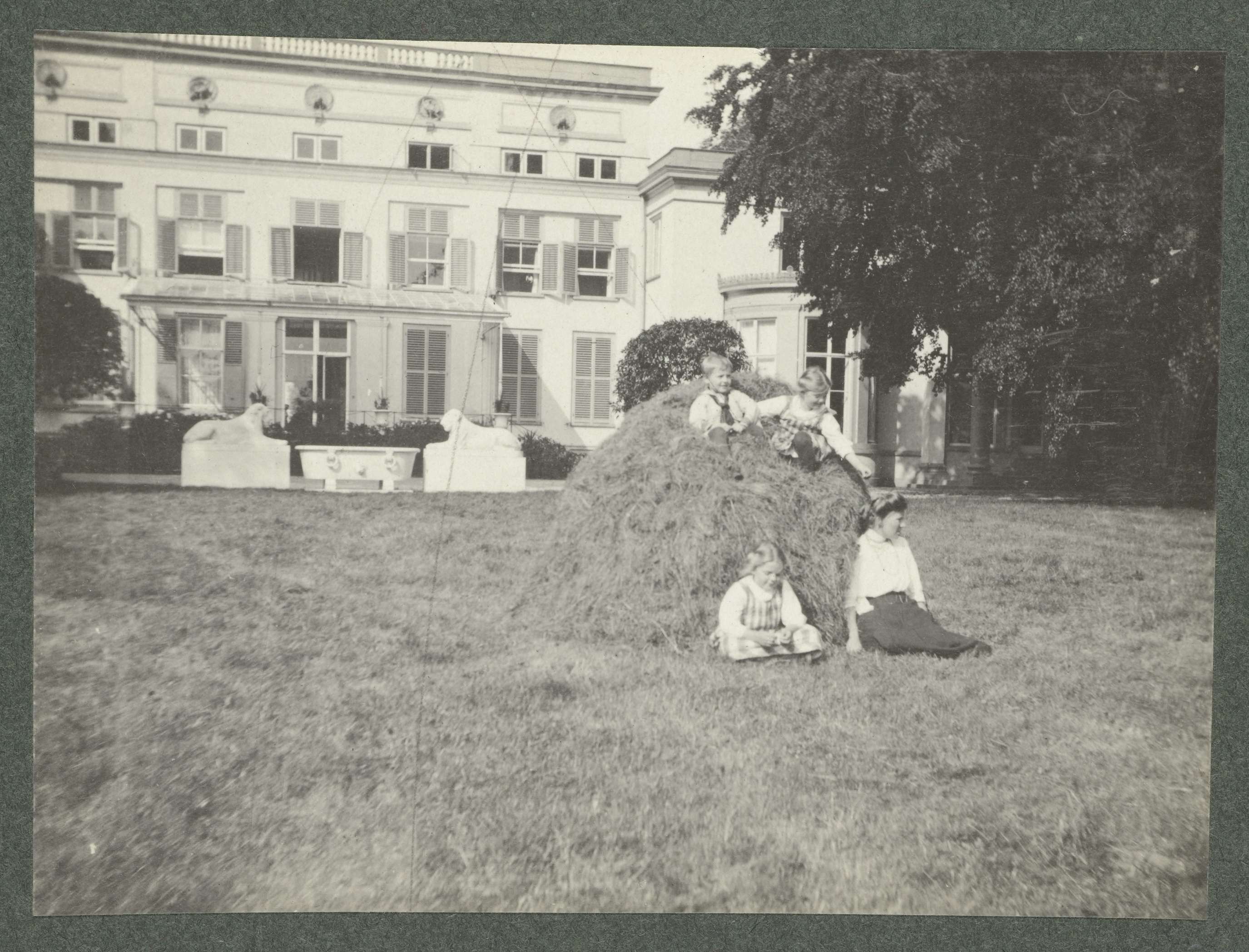 Kinderen in een berg gemaaid gras in de tuin van Lan...