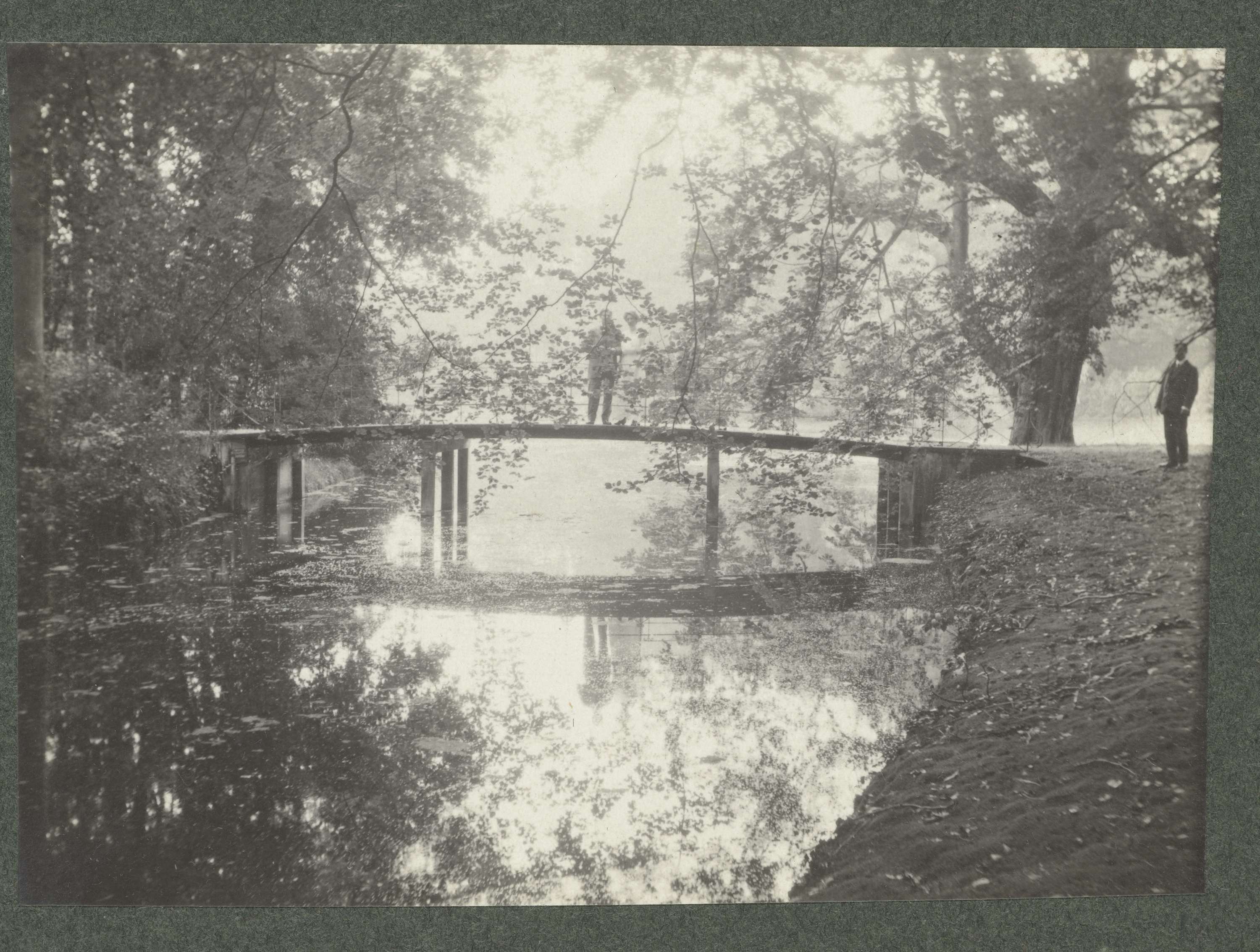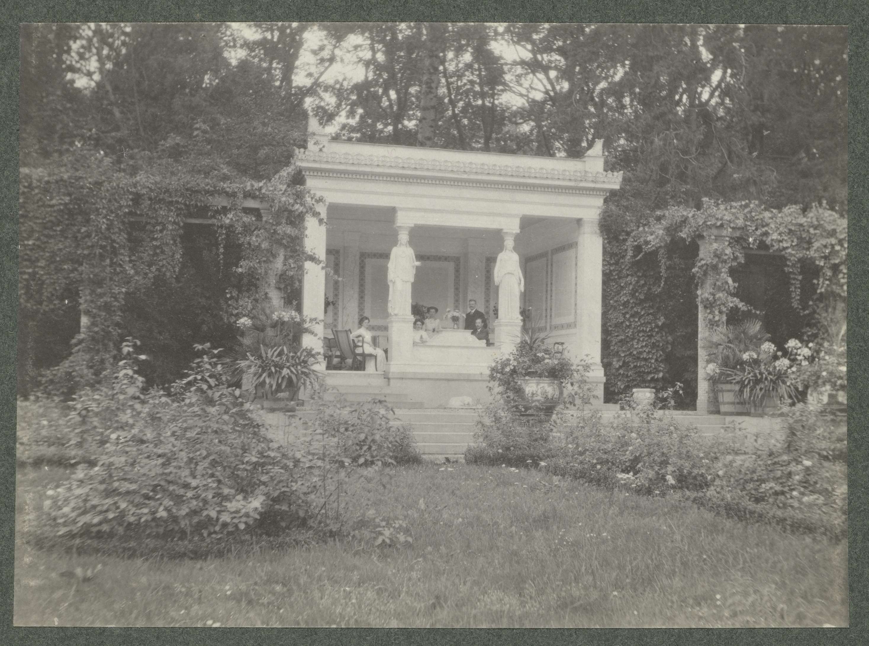 Overdekt theehuis met mensen, in de tuin van Landgoe...