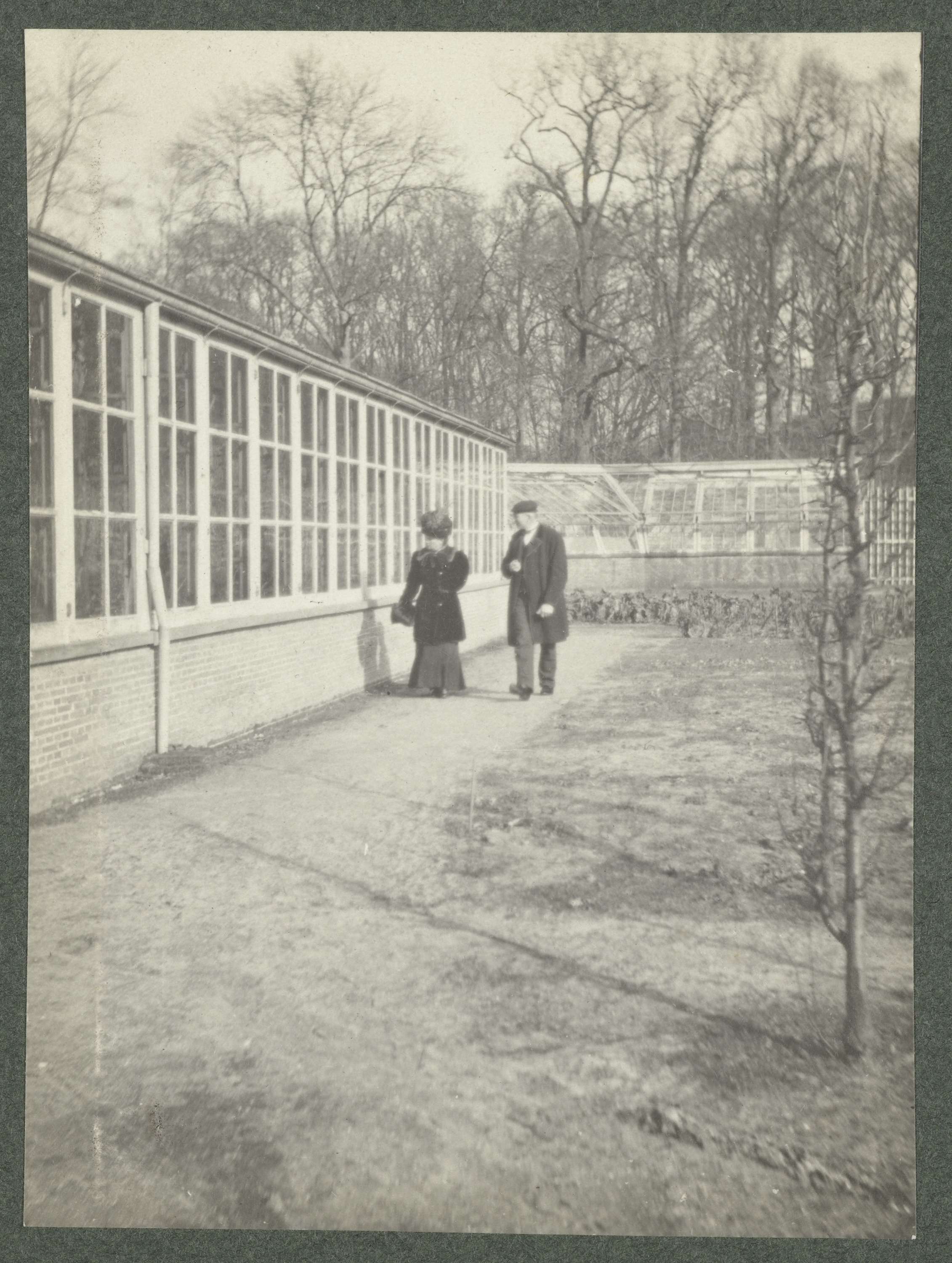 Margo J. J. Kessler en man wandelend over een tuinpad
