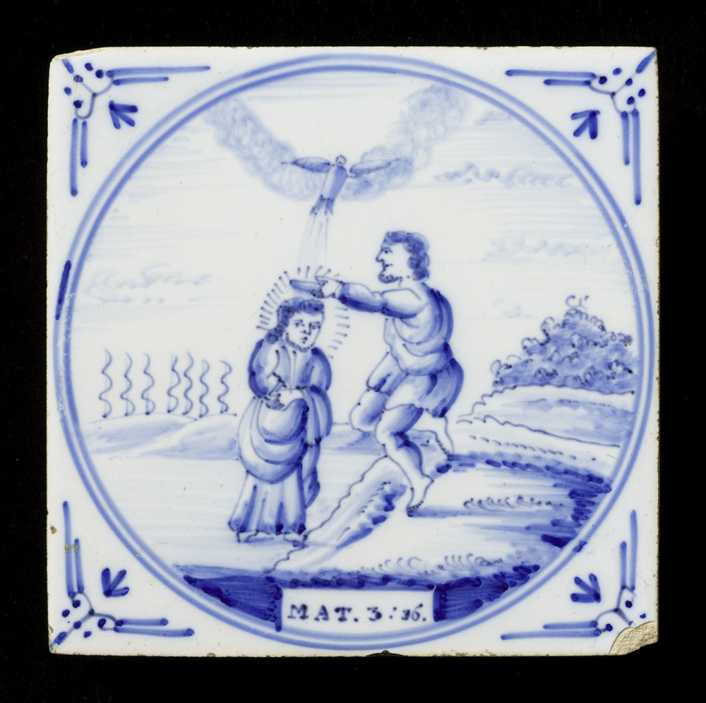 Tegel van keramiek met tinglazuur, voorstellende: De...