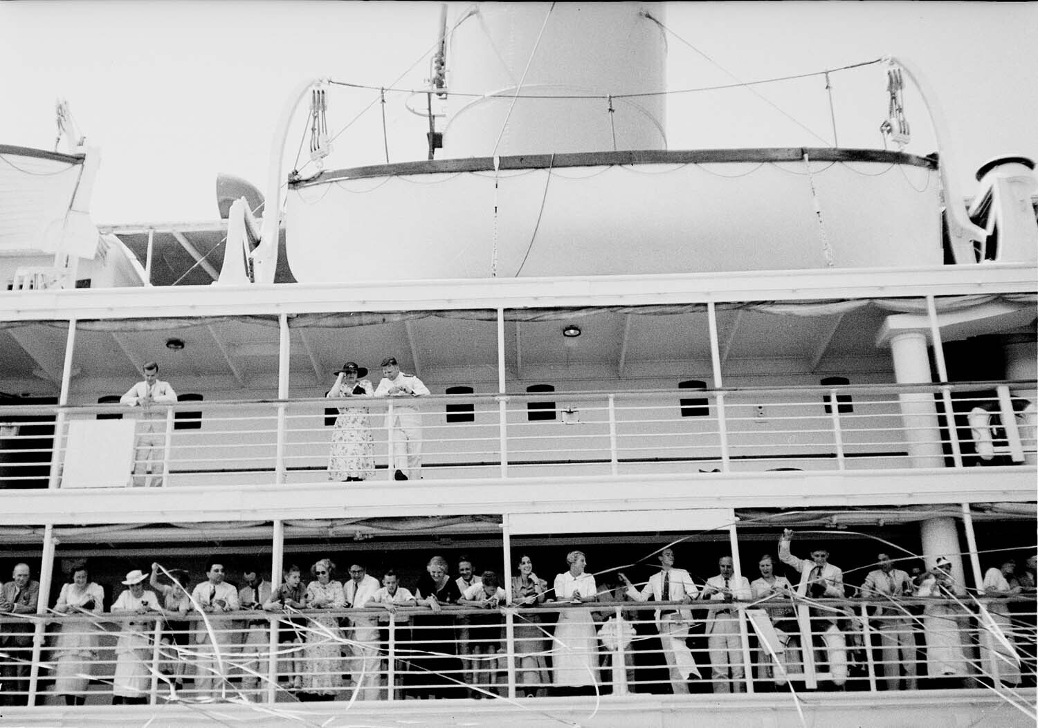Afscheidnemers met serpentineslingers op de kade van...