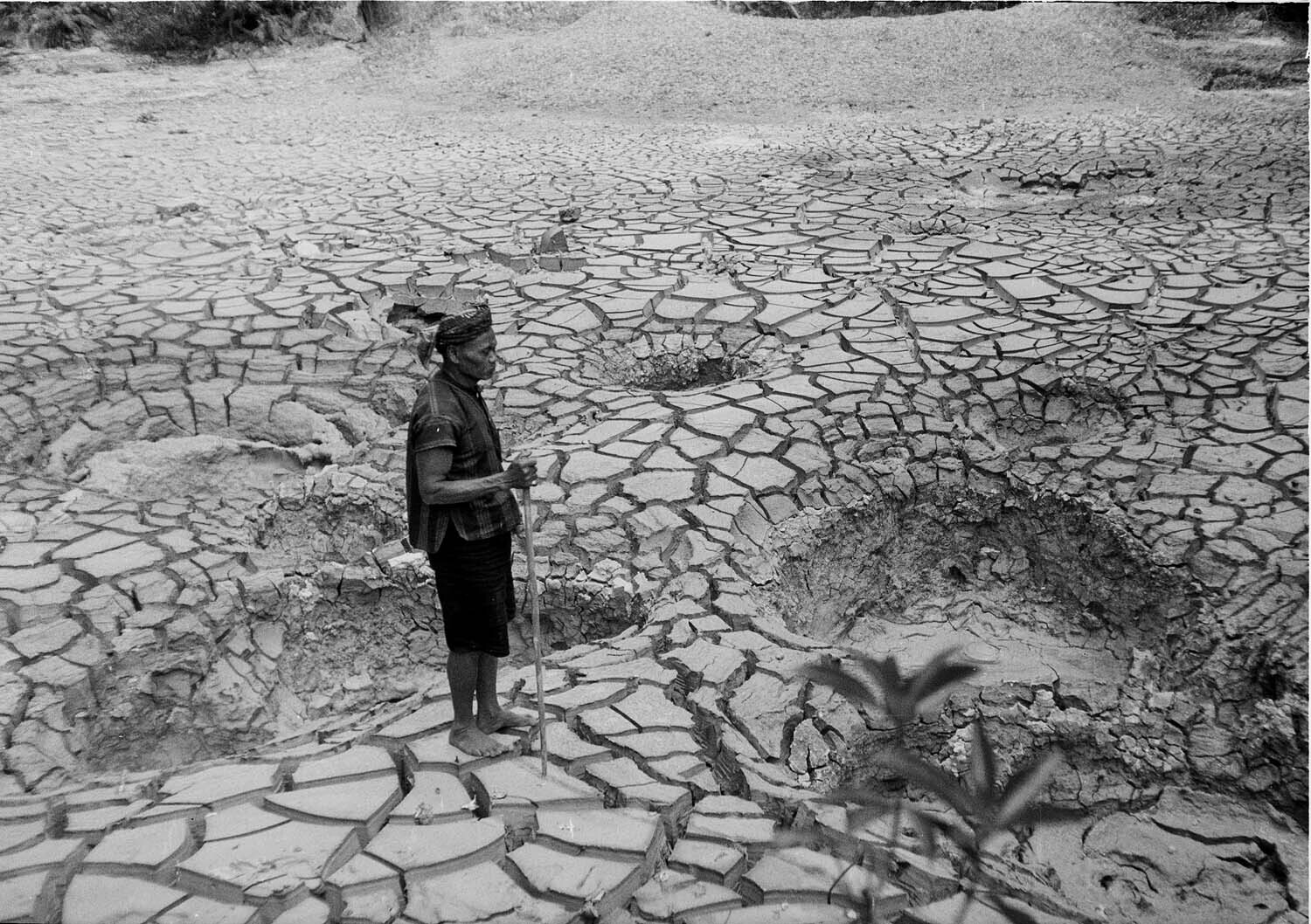 Man in vulkaanlandschap of op een stuk kleigrond na ...