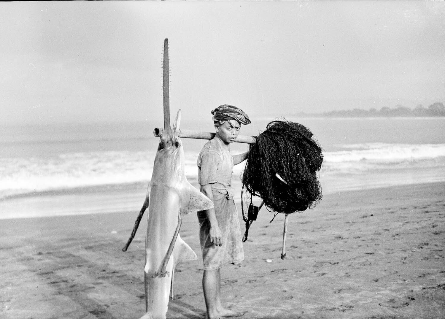 Man op het strand met een gevangen zaagvis, Nederlan...