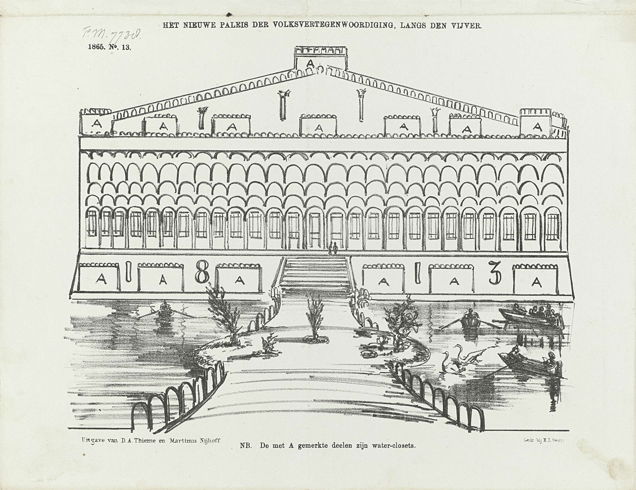 Spotprent op het ontwerp voor het paleis der Staten-...