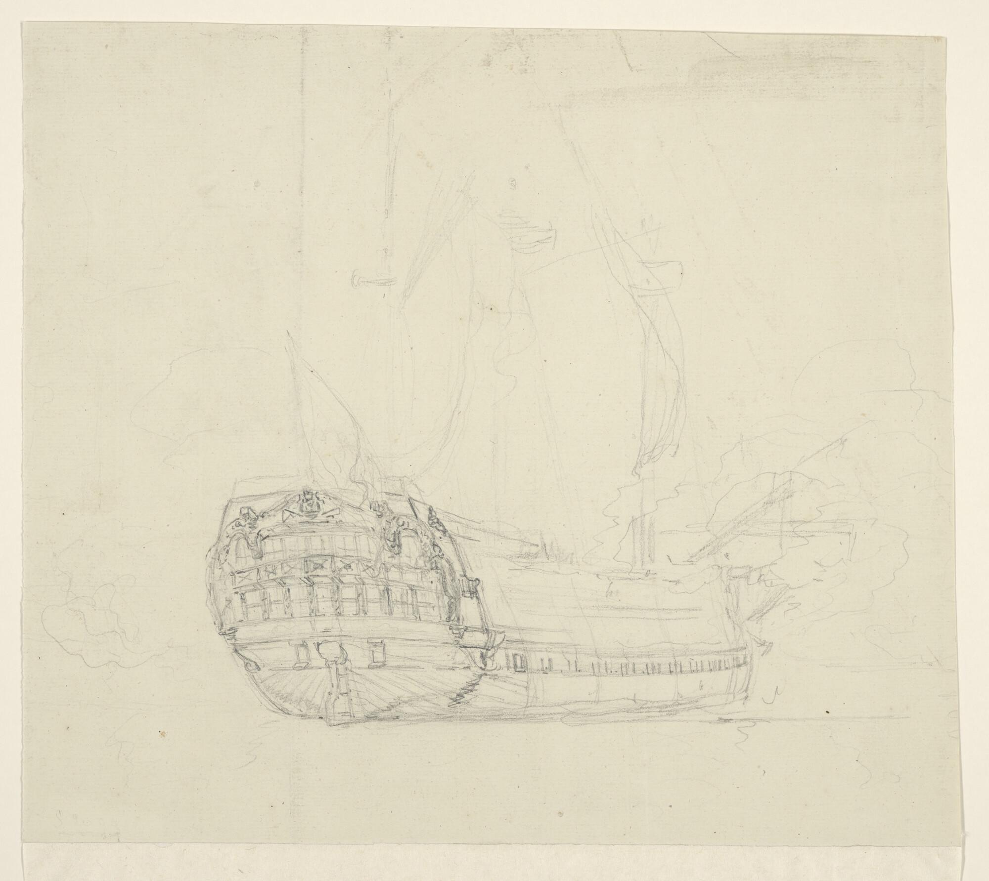 Een oorlogsschip gezien van bakboord voor en andere ...