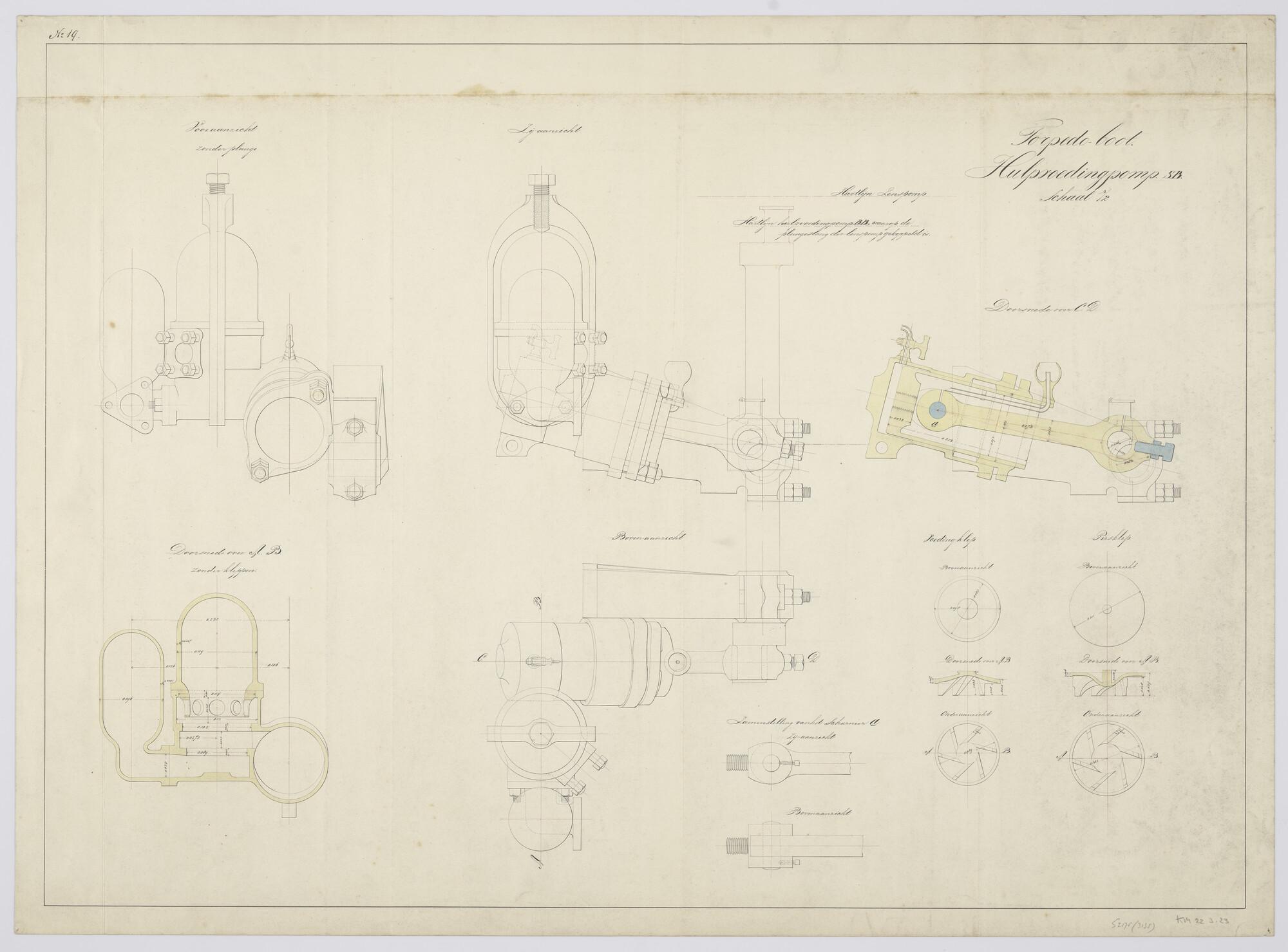 Diverse aanzichten en doorsneden van de pomp met kle...