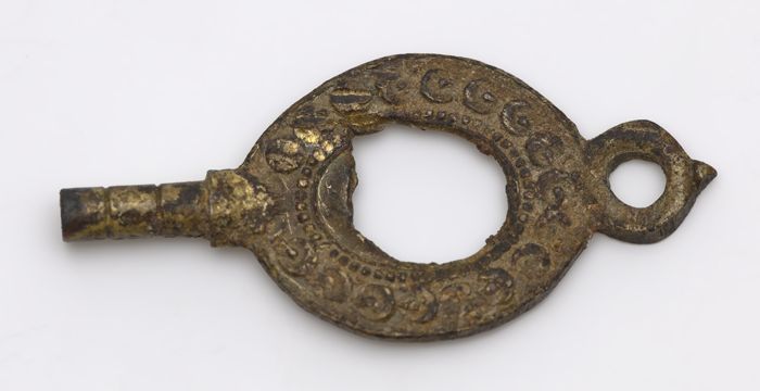 Horlogesleutel, ovaal met ophangoog, verguld koper