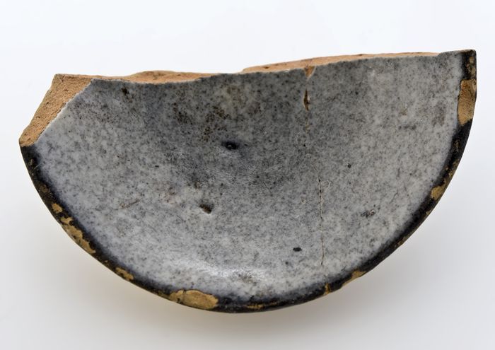 Fragment van kleine faience bak, inwendig wit geglaz...