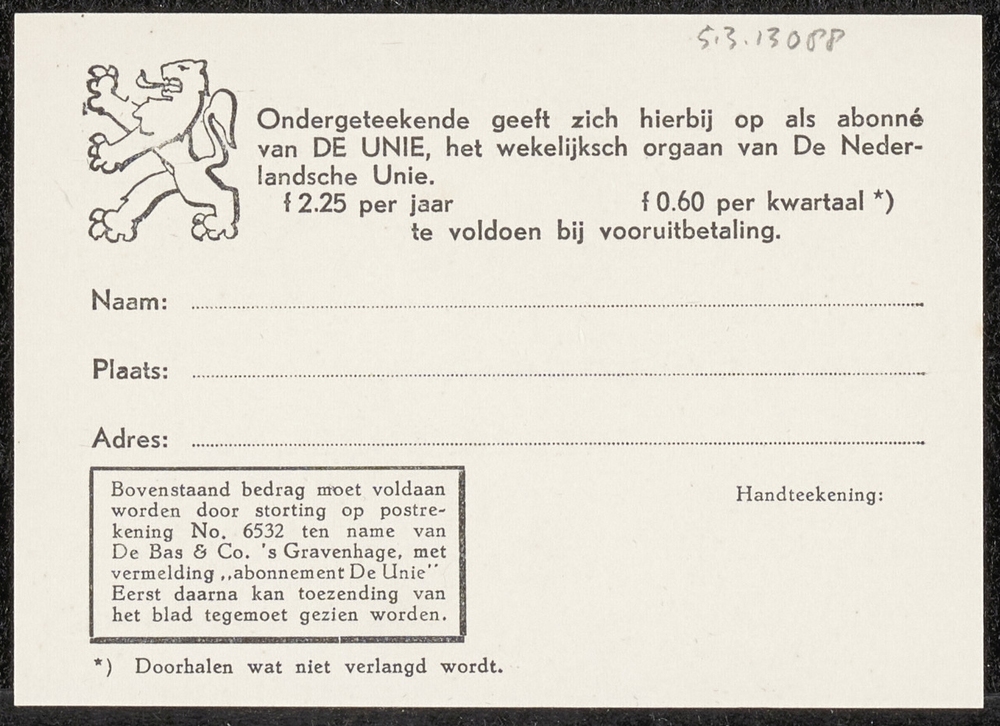 Kaart om zich op te geven als lid van de Nederlandsc...