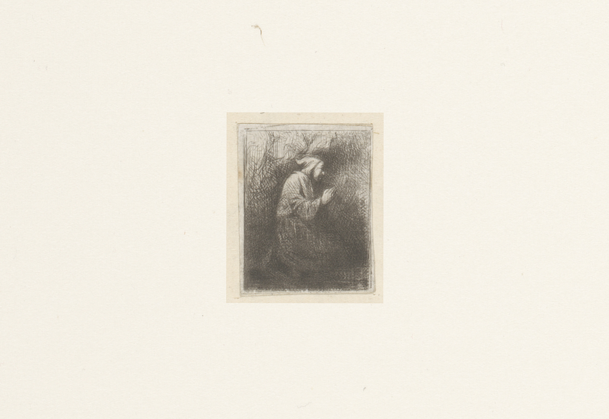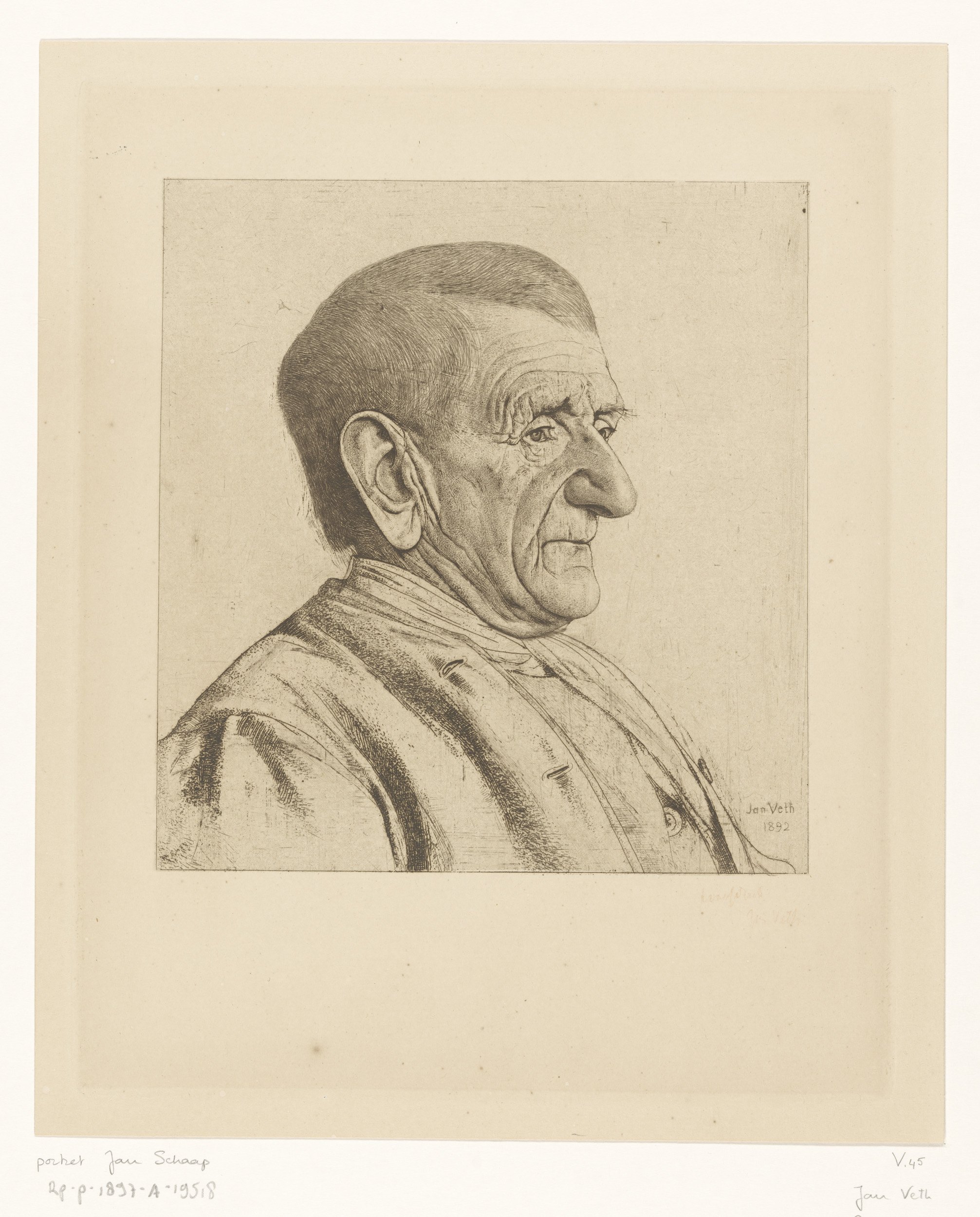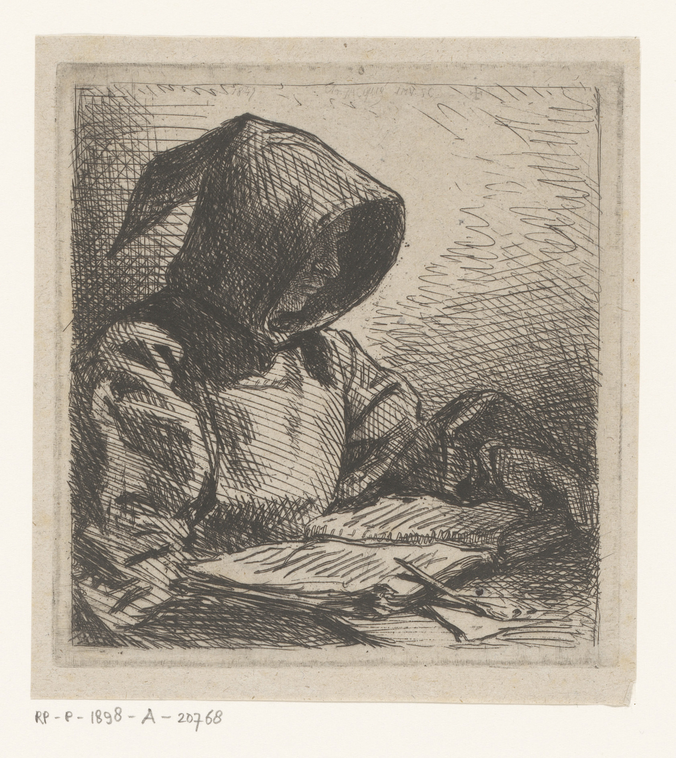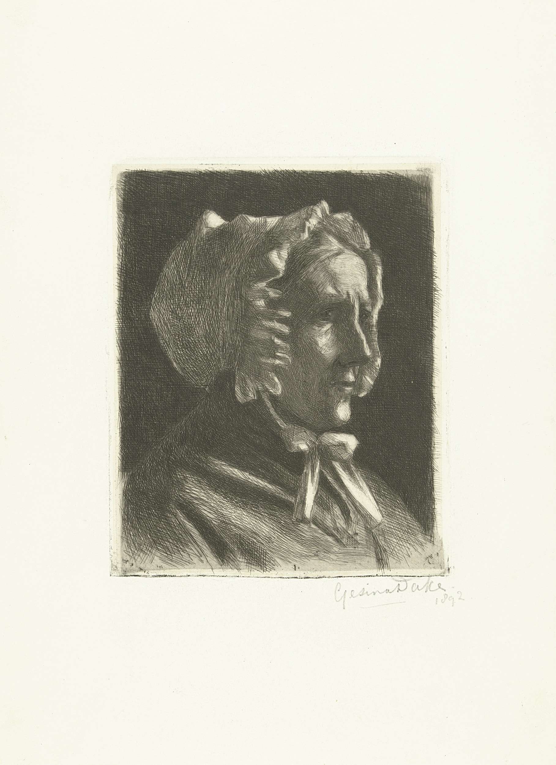 Hoofd van oude vrouw met zwart kapje en doek om haar...