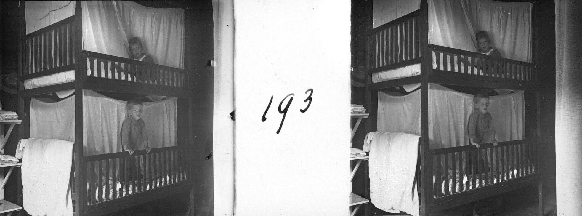 De broers Henk en Hans Japing in een stapelbed met k...