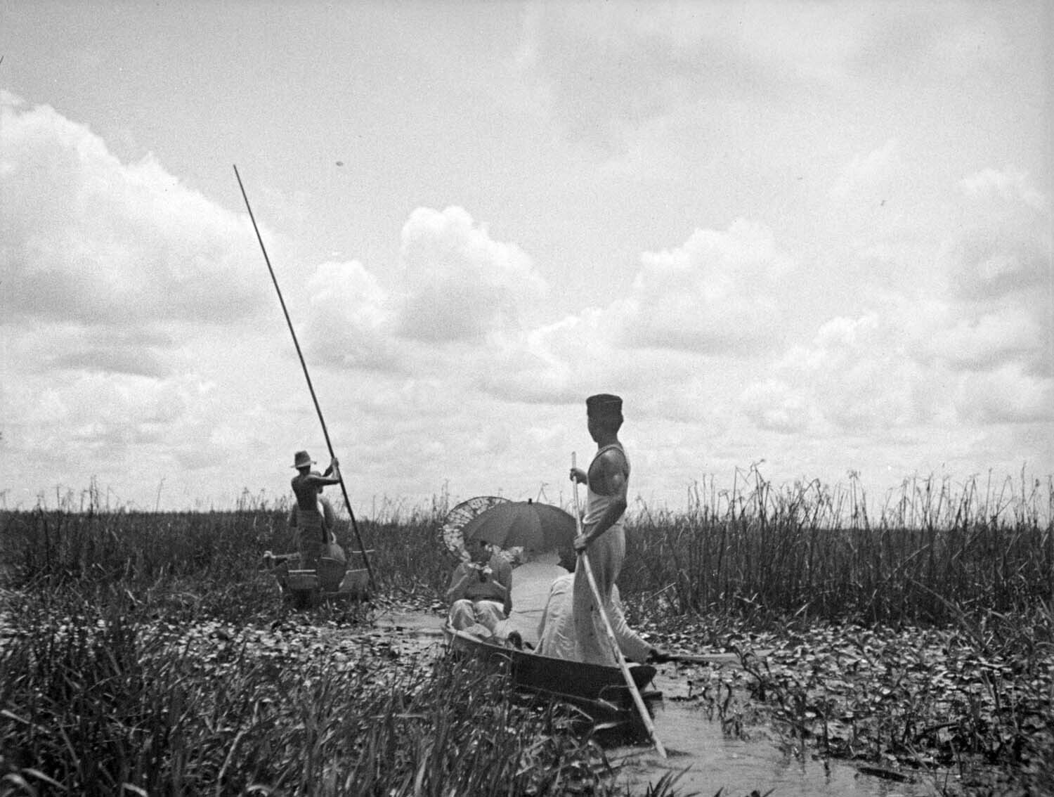 Europeanen tijdens een tochtje over een met waterpla...
