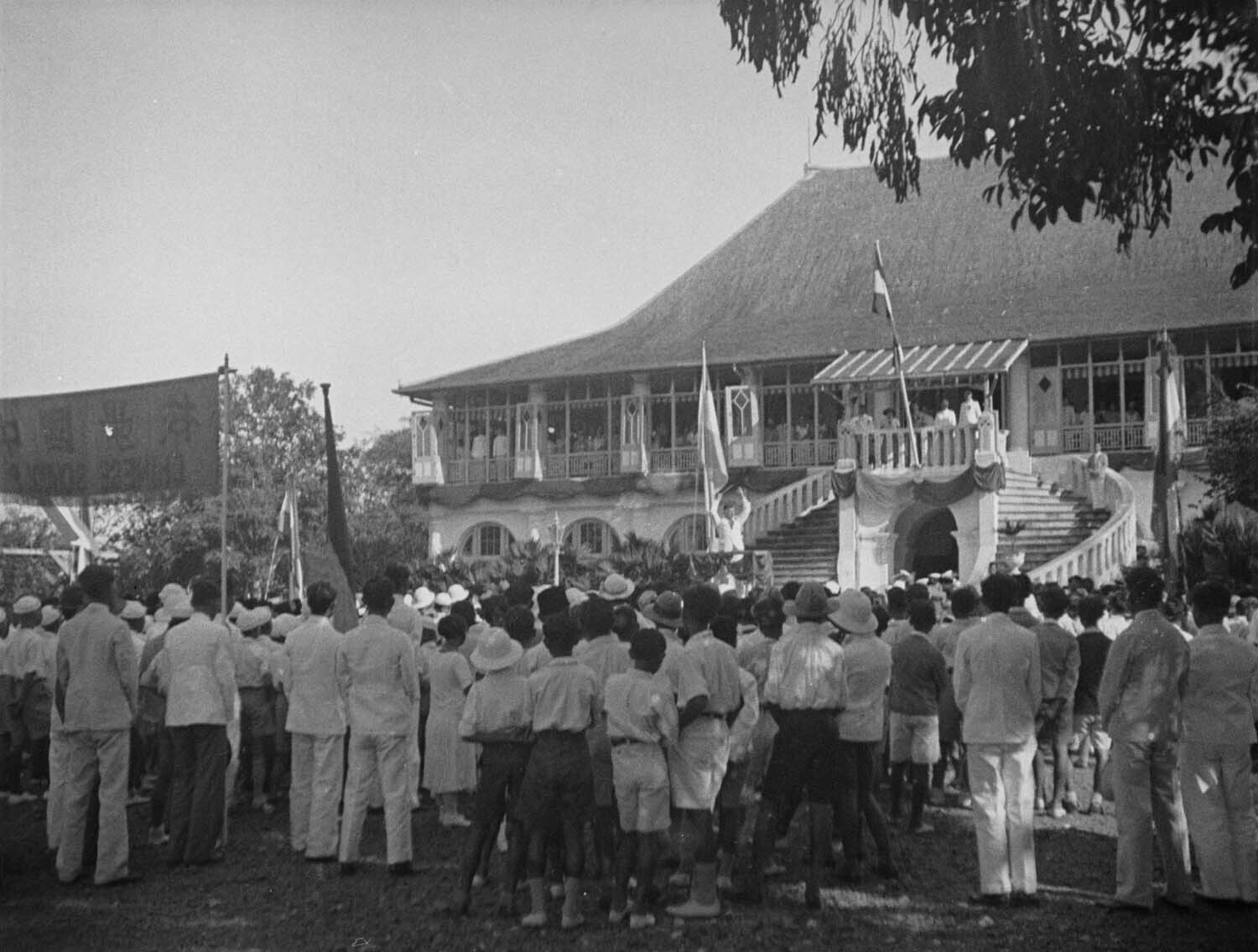 Mensen luisteren voor het residentiehuis in Palemban...