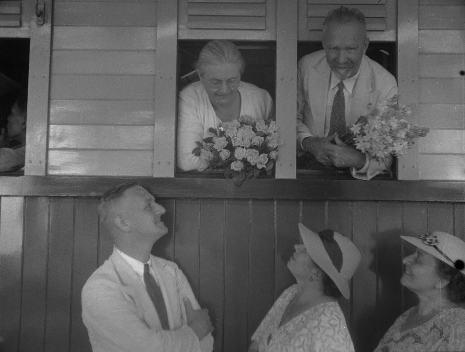 Afscheid van Europeanen bij het raam van een treinco...