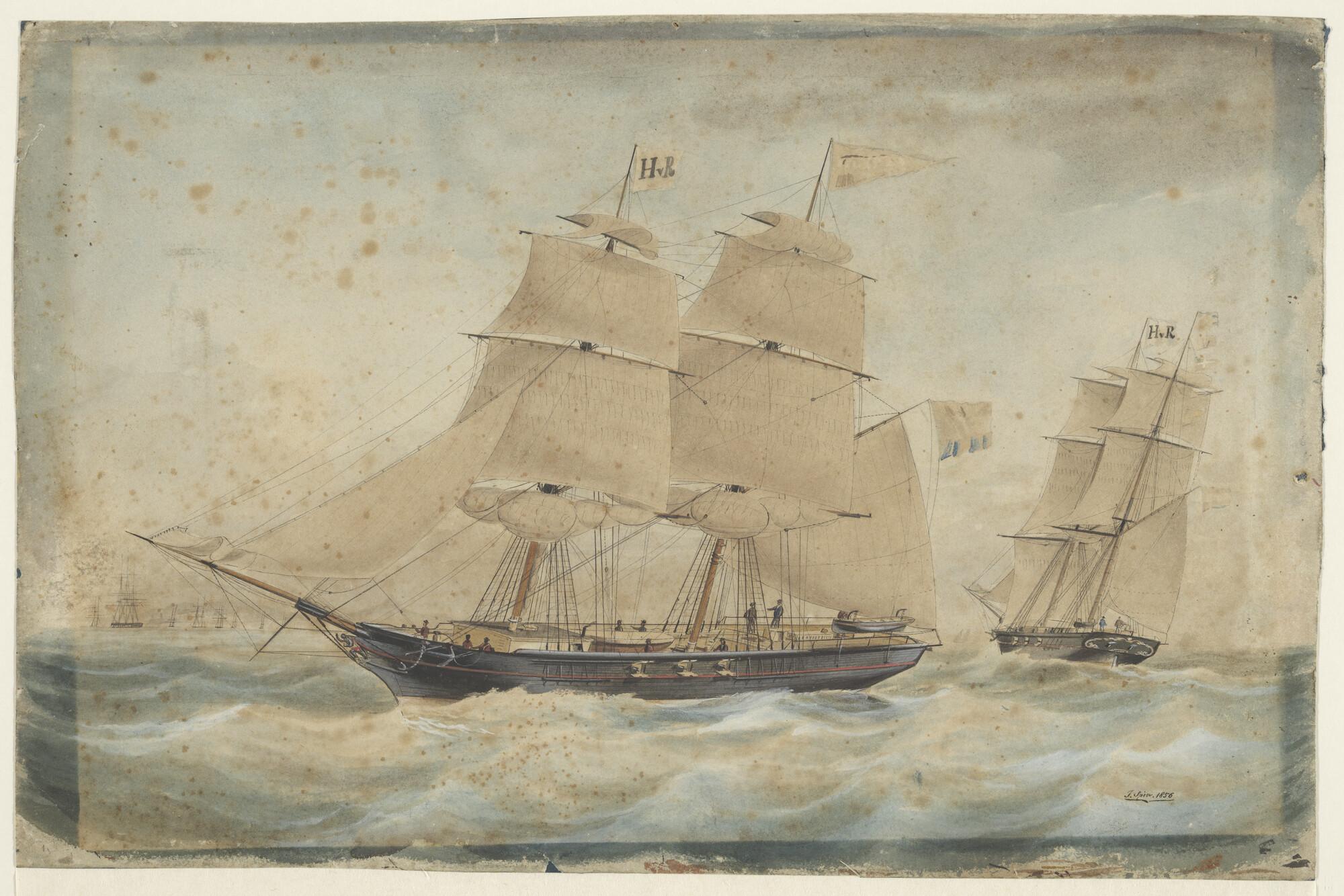 Een driemaster en een hoogaars op ruim water