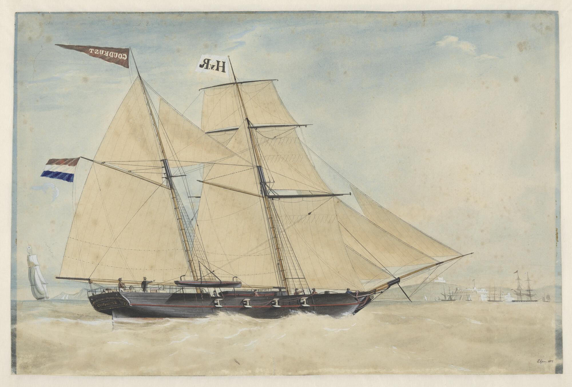 Het schoenerbrikschip Goudkust zeilend naar de rede ...
