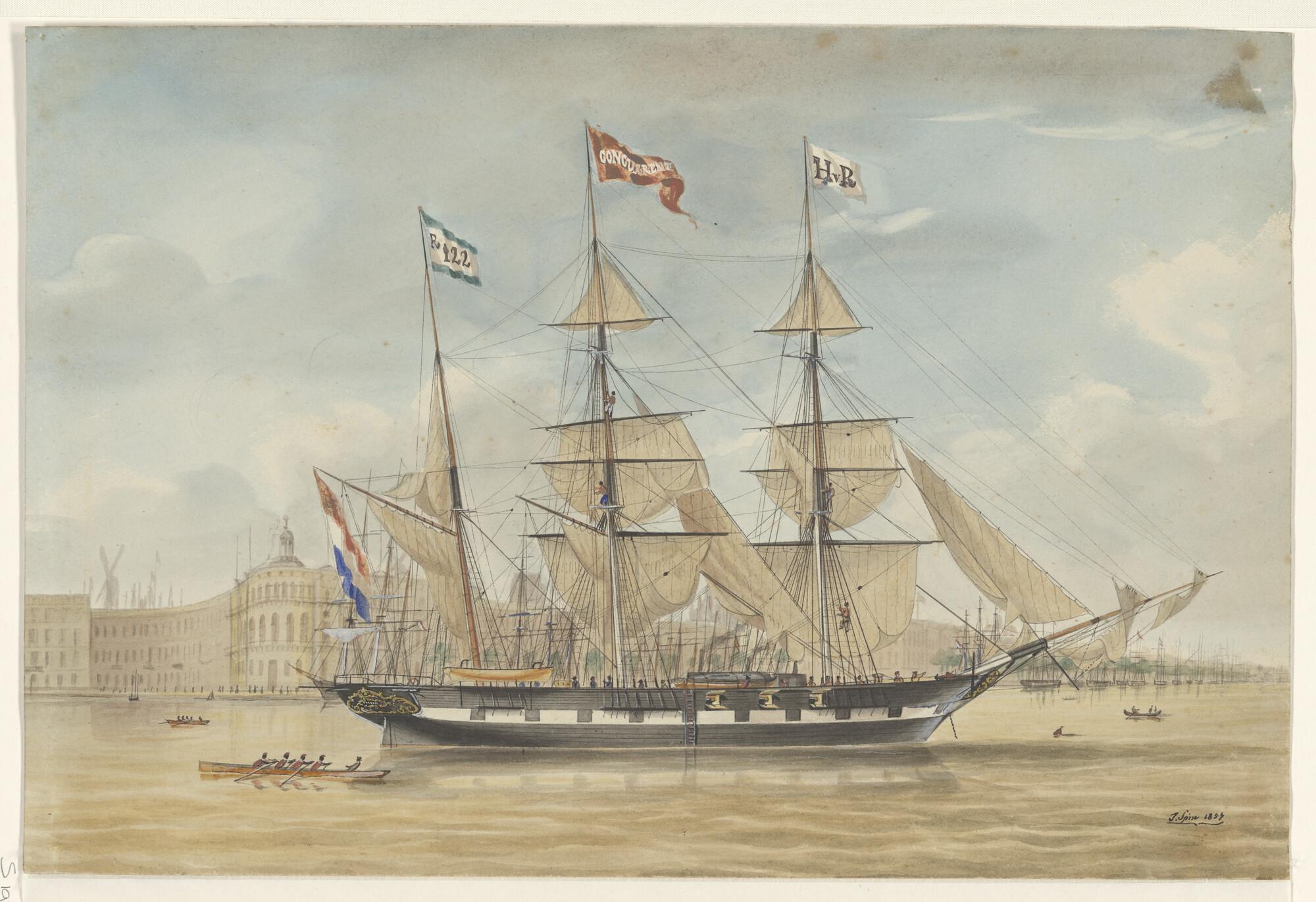 Het barkschip Concurrent voor anker op de Maas te Ro...