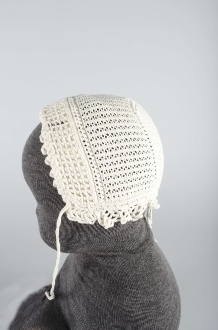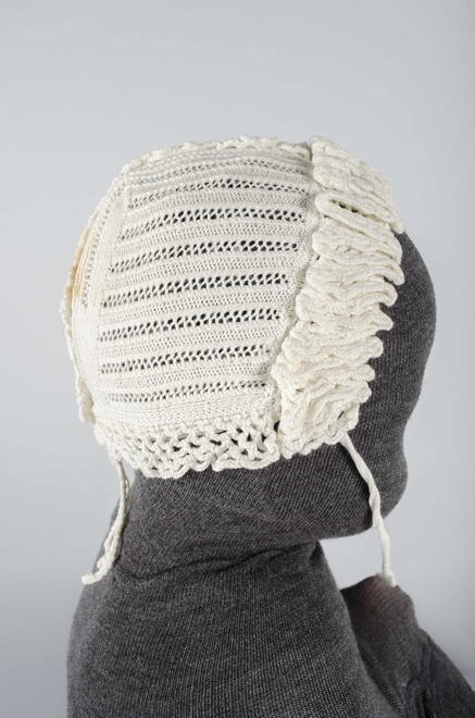 Wit katoenen mutsje van haakwerk met opstaande 'hane...