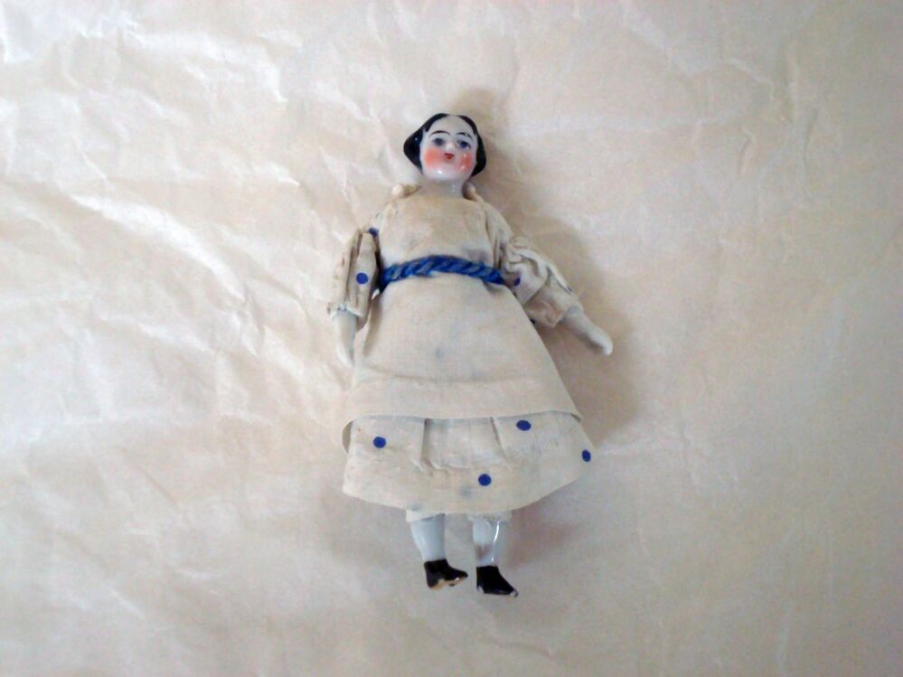 Kleine houten pop met gesneden haarknot, gekleed in ...