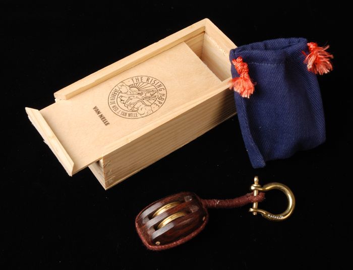Houten blok met twee katrollen in kist met opdruk "V...