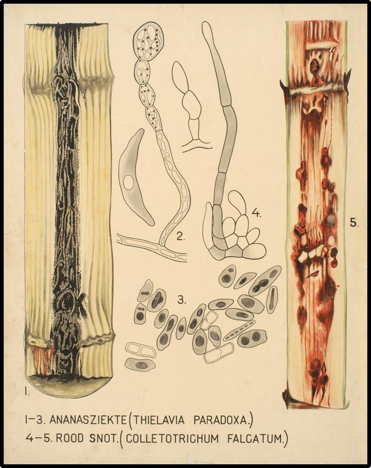 1-3 Ananasziekte (Thielavia paradoxa.) 4-5 Rood snot...