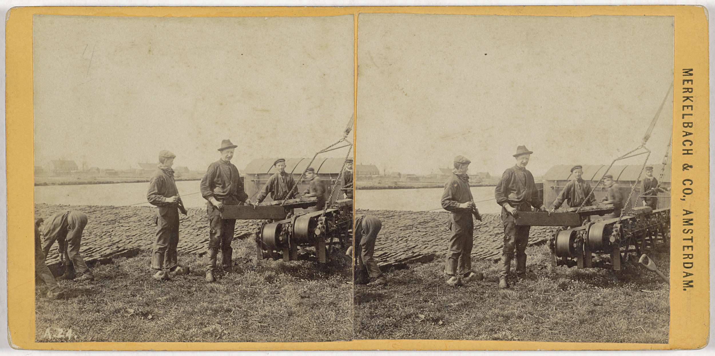 Gezicht op een rijksturfpersmachine in het laagveen ...