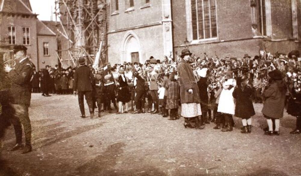 Zwart-wit foto van de schutterij op de dijk in Herwe...