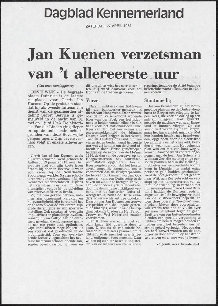 Jan Kuenen verzetsman van 't allereerste uur