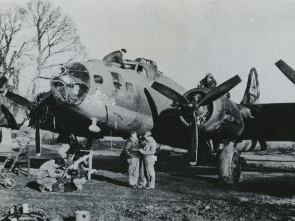 Foto Boeing B-17F op vliegbasis. Tekst: "Boeing B-17...