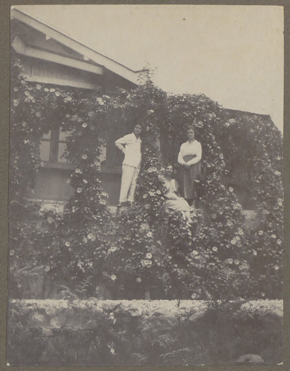 Corry Kan en twee vrouwen poserend voor huis