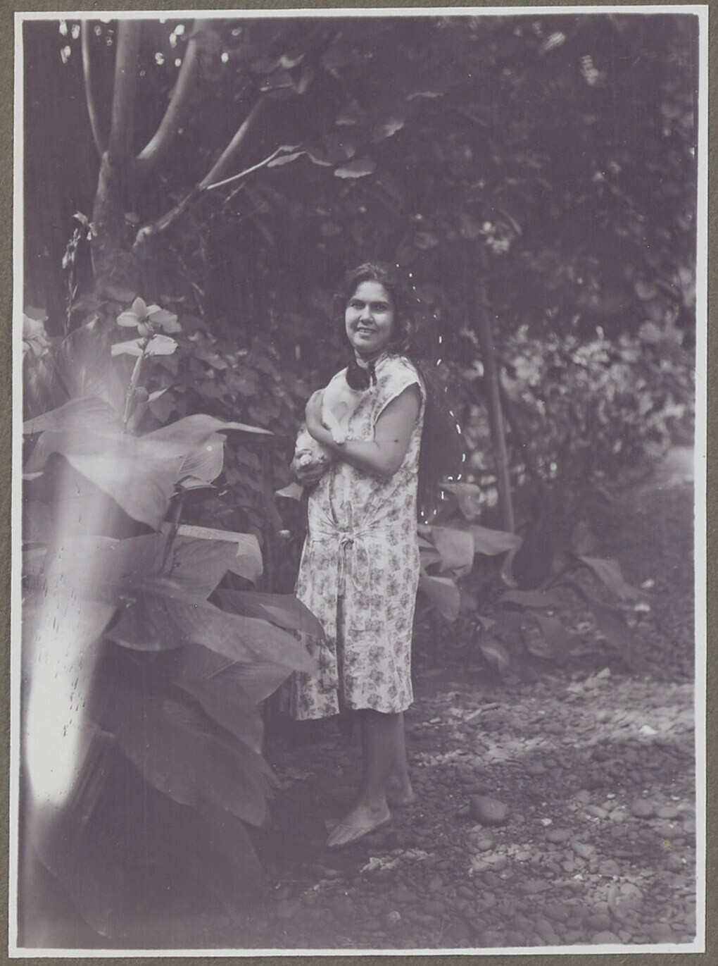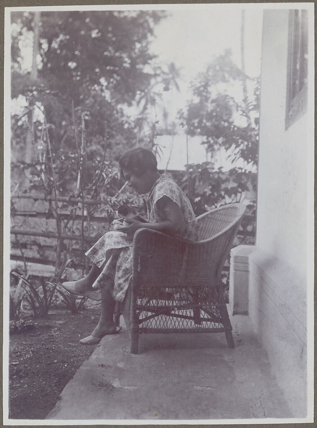 Corrie Kan met poes in tuin
