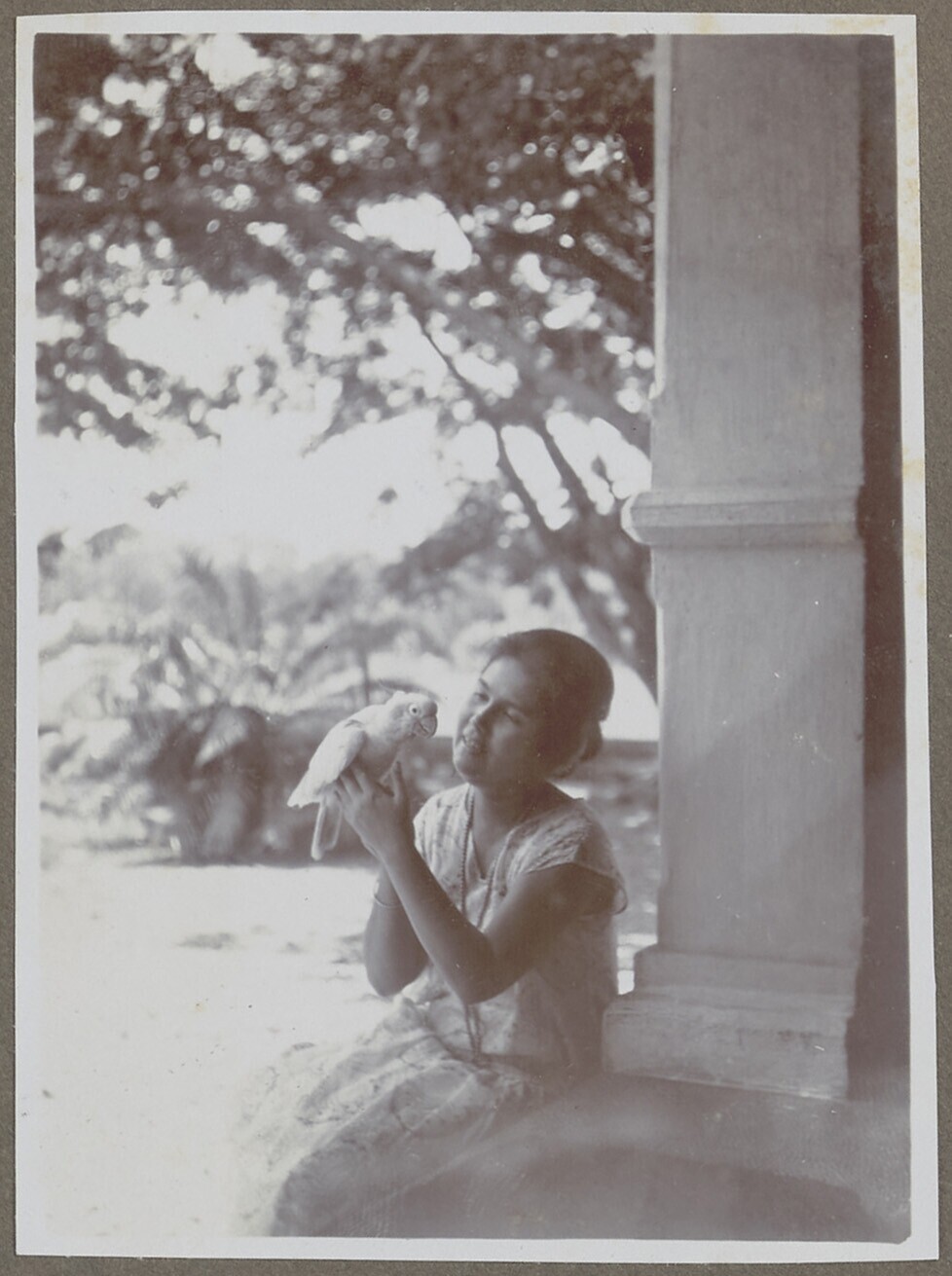 Corry Kan met kaketoe voor huis, Makassar