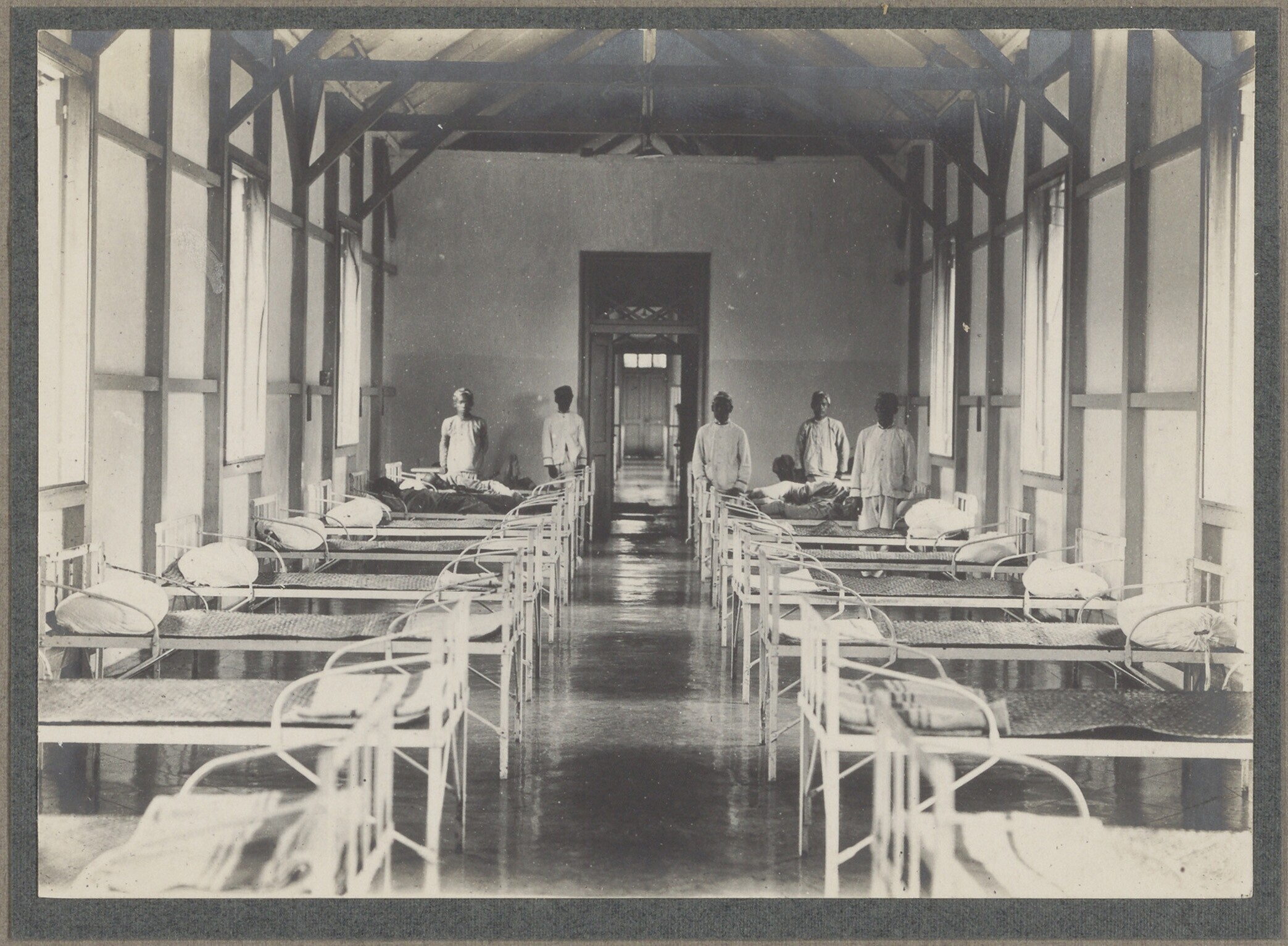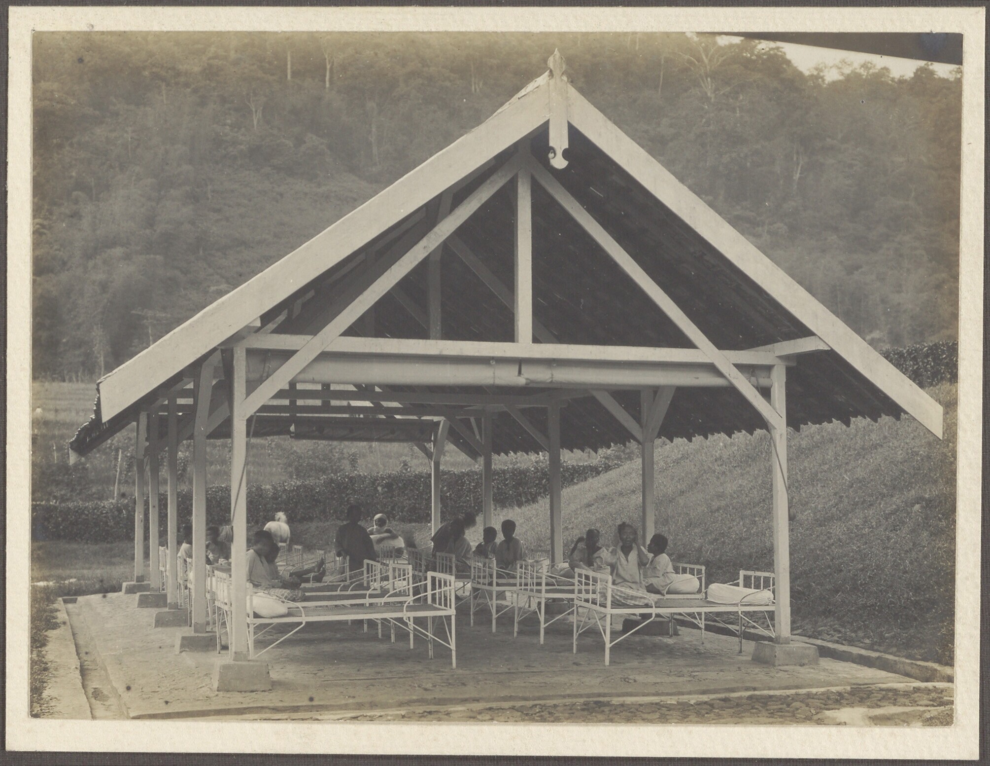 Een buitenzaal met bedden waar zieken worden verpleegd