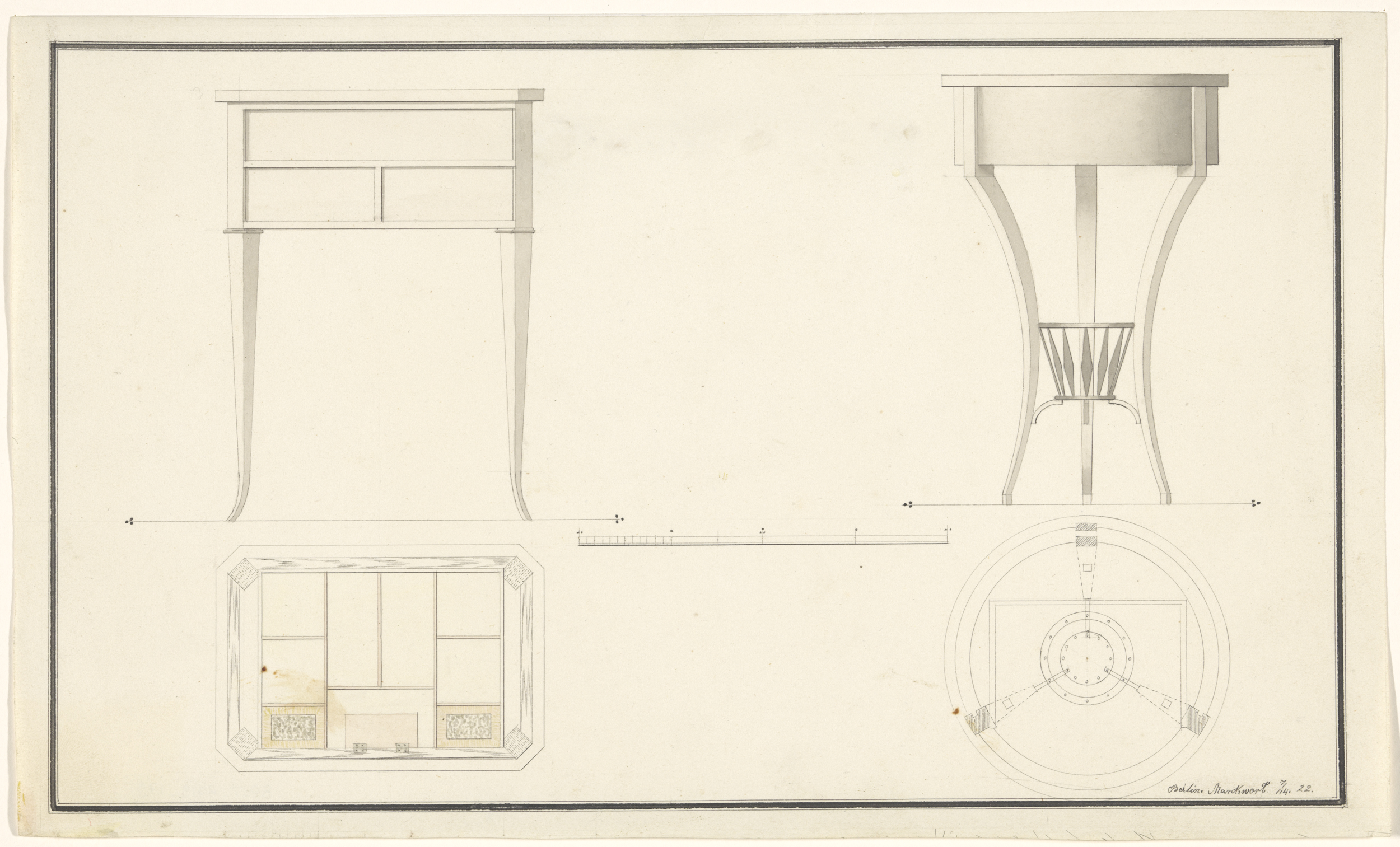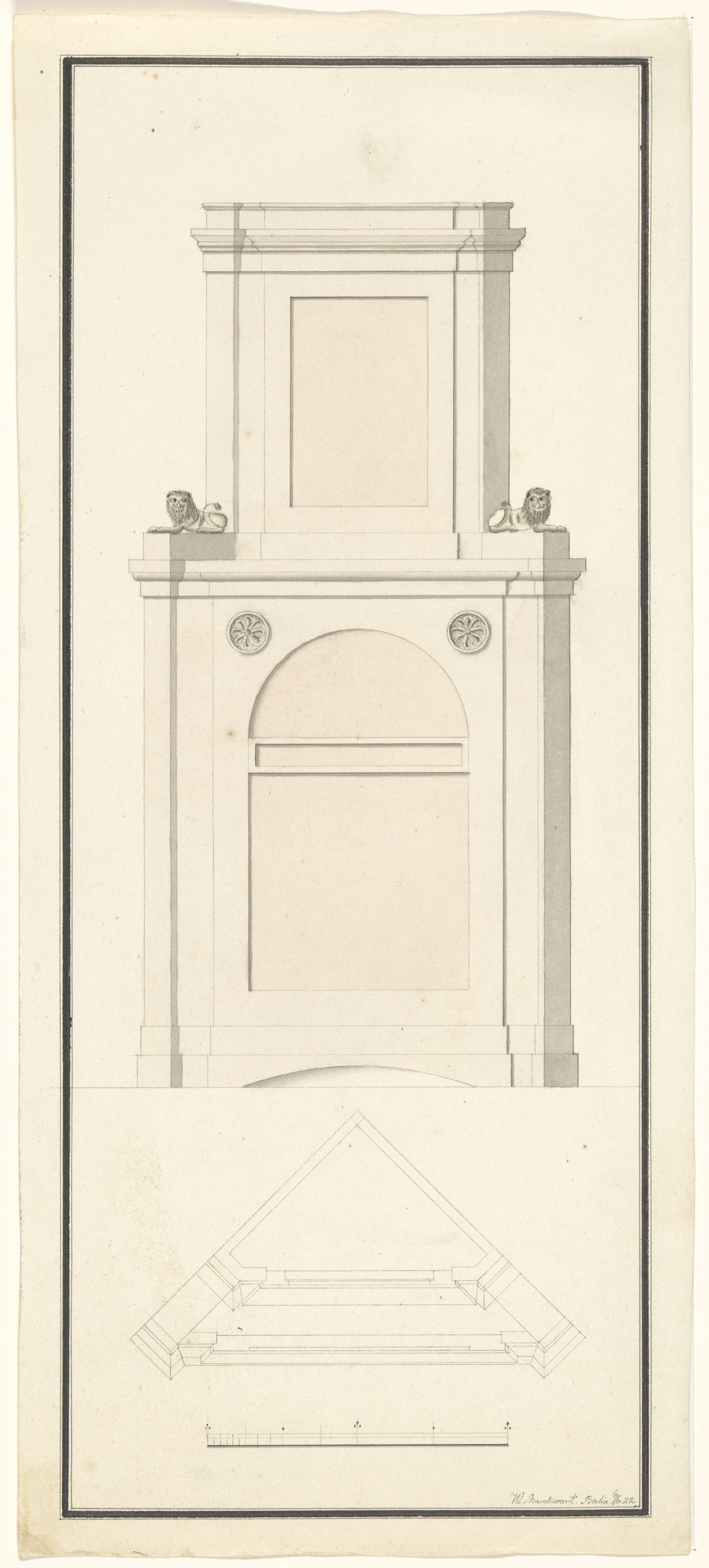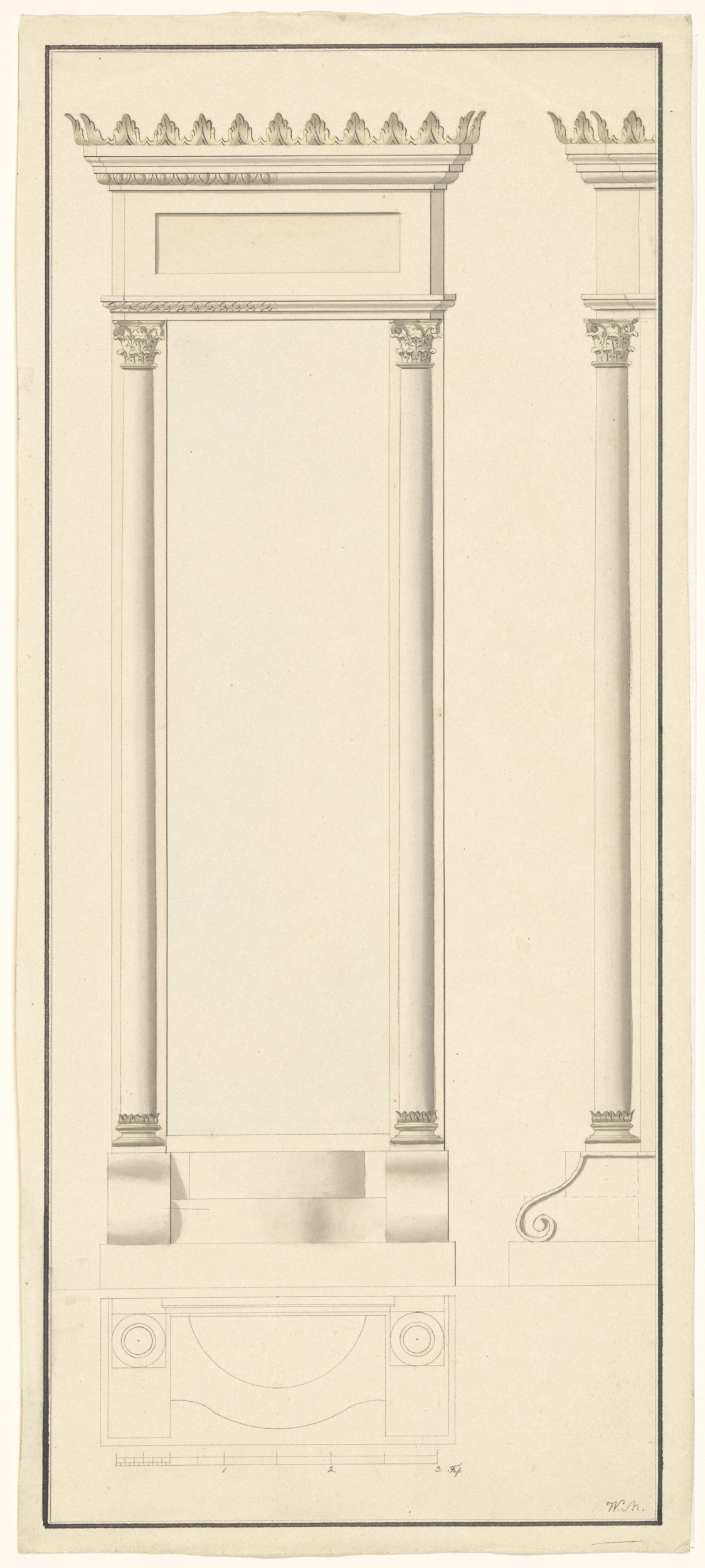 Spiegeltrumeau, voor- en zijaanzicht met daaronder d...