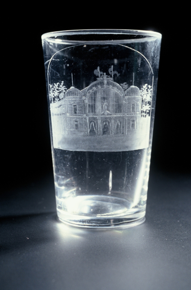 Souvenirglas met tekst ‘Tentoonstelling Arnhem 1879’