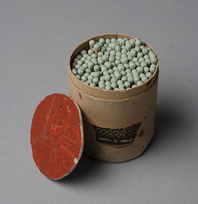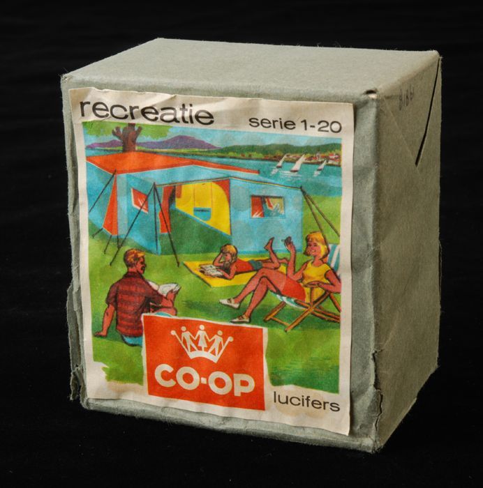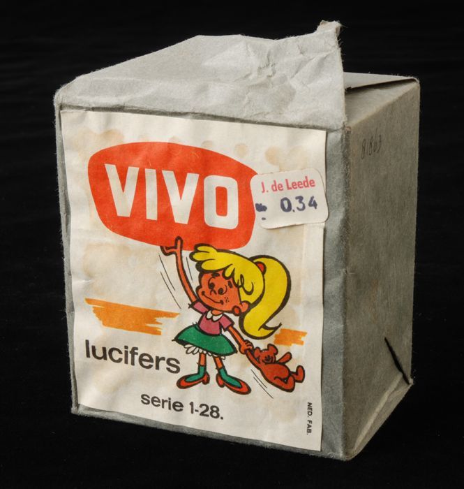 Grijsgroene wikkel met tien luciferdoosjes en etiket...