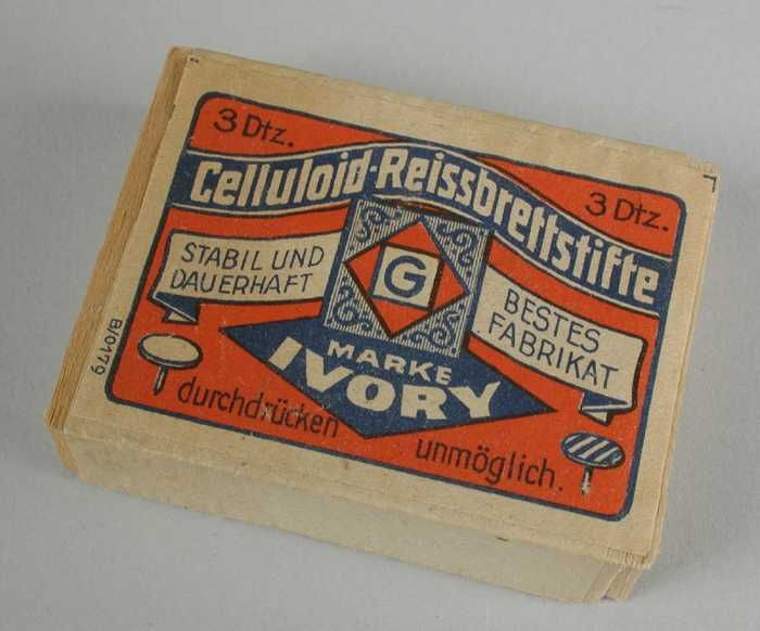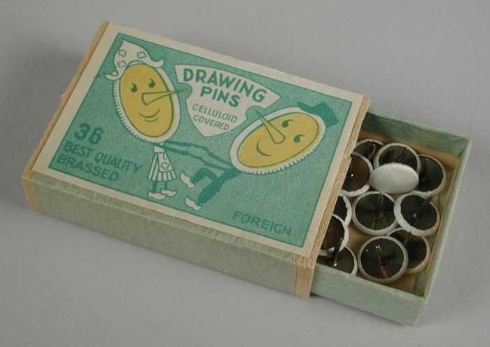 Kleine spanen doos met punaises, witte, celluloid ko...