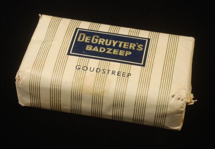 In papier verpakte "De Gruyter's" badzeep, wit, donk...