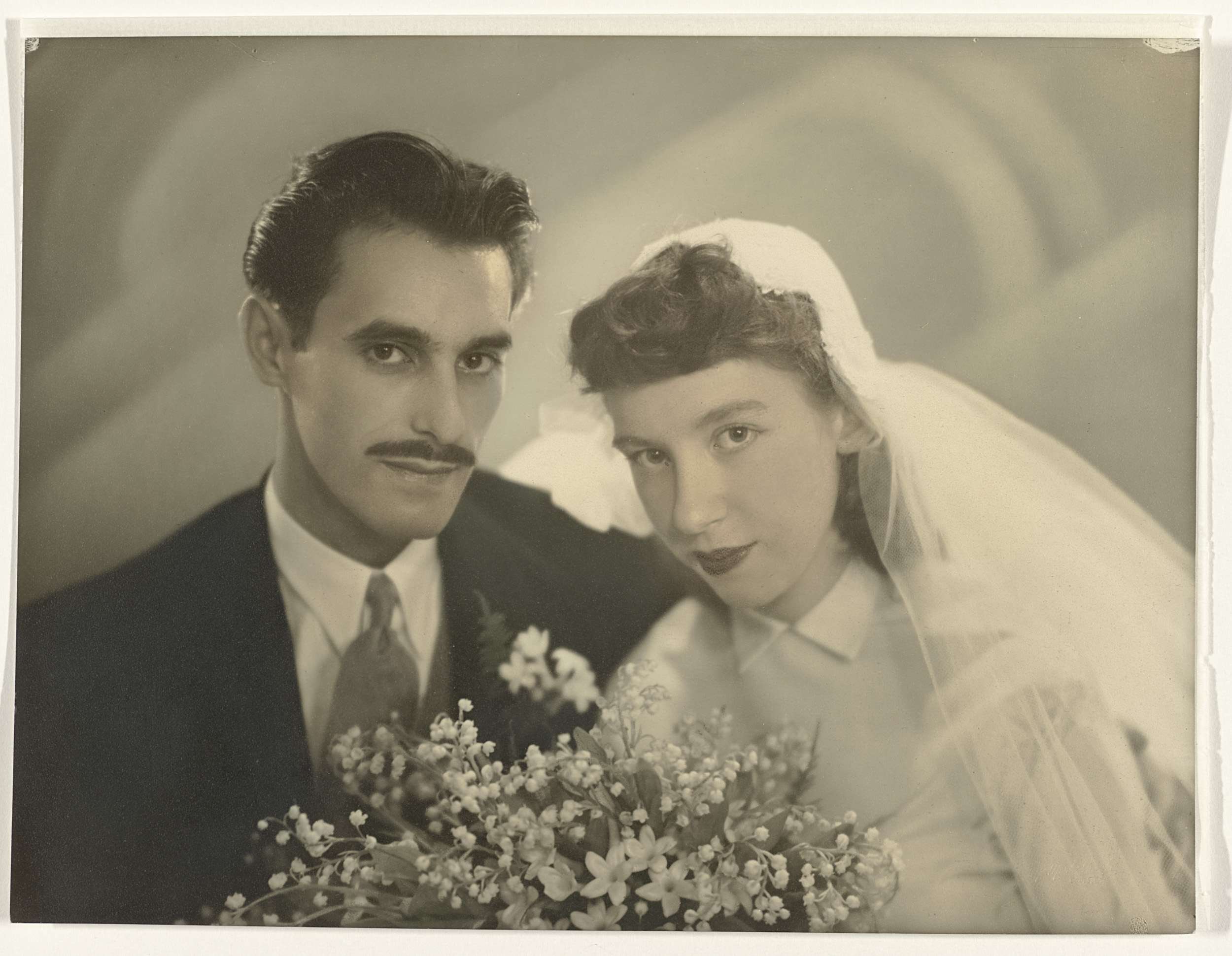 Portret van een bruidspaar met boeket