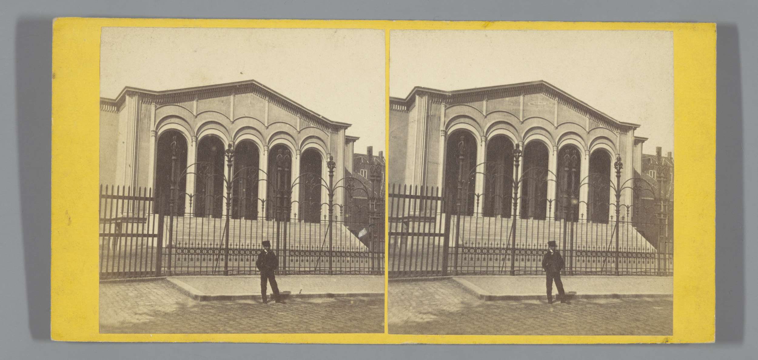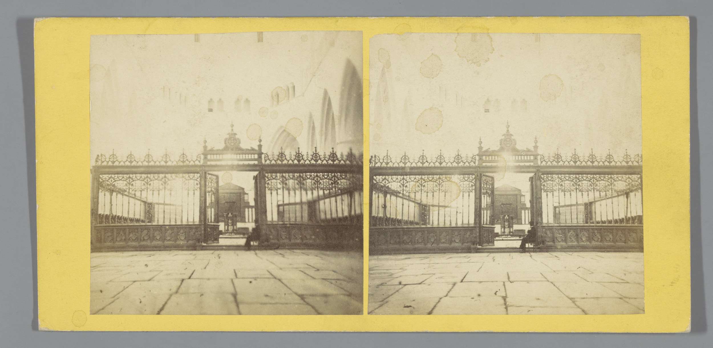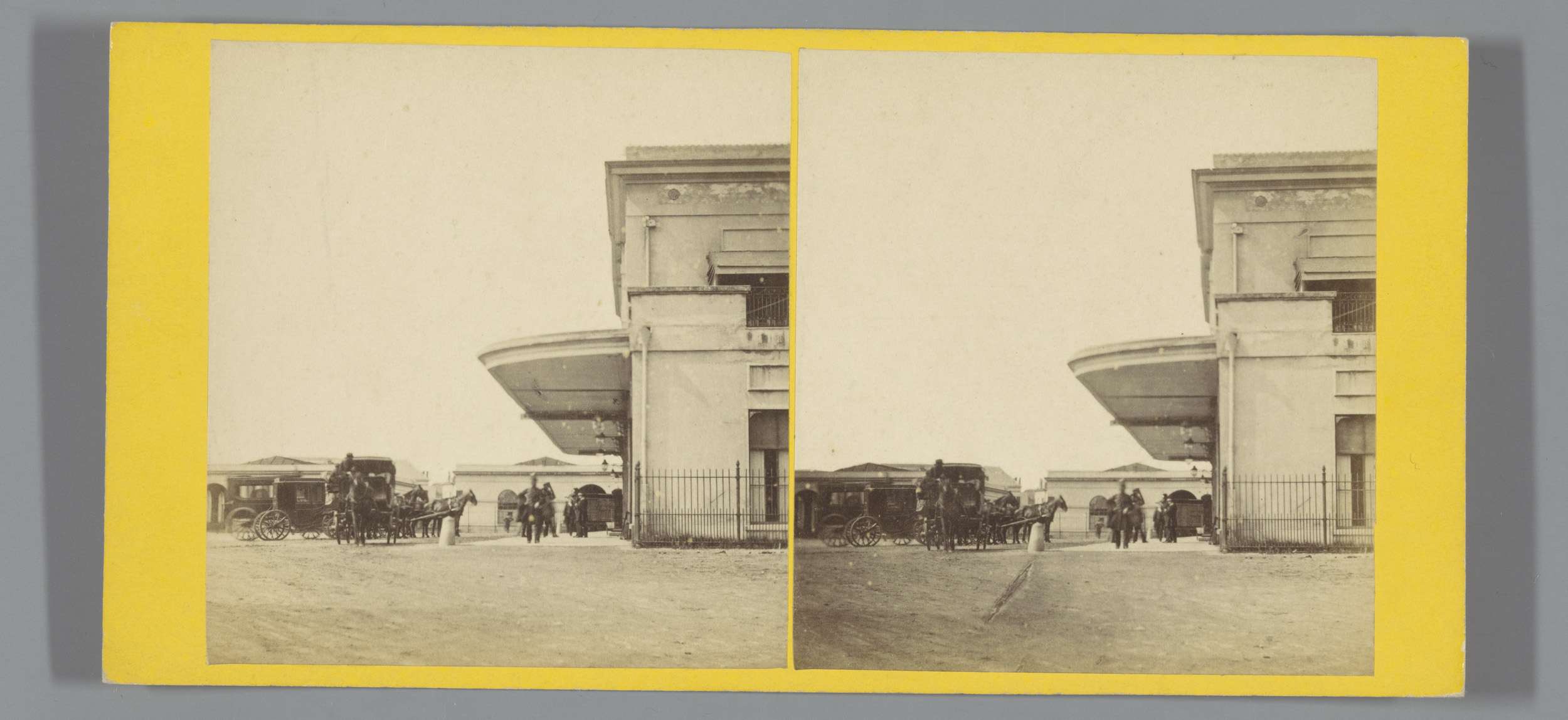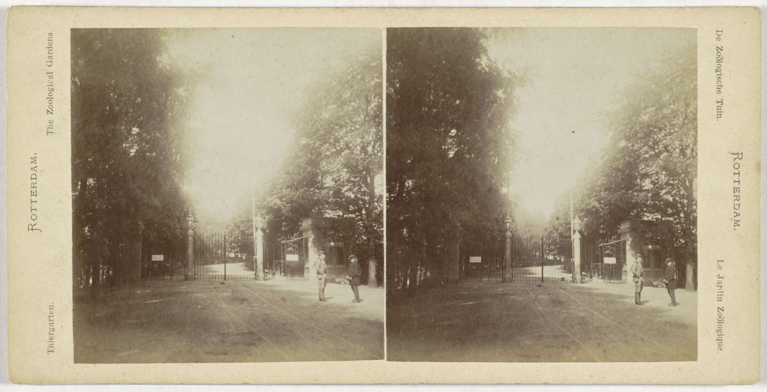 Gezicht op het toegangshek van de Zoölogische Tuin o...