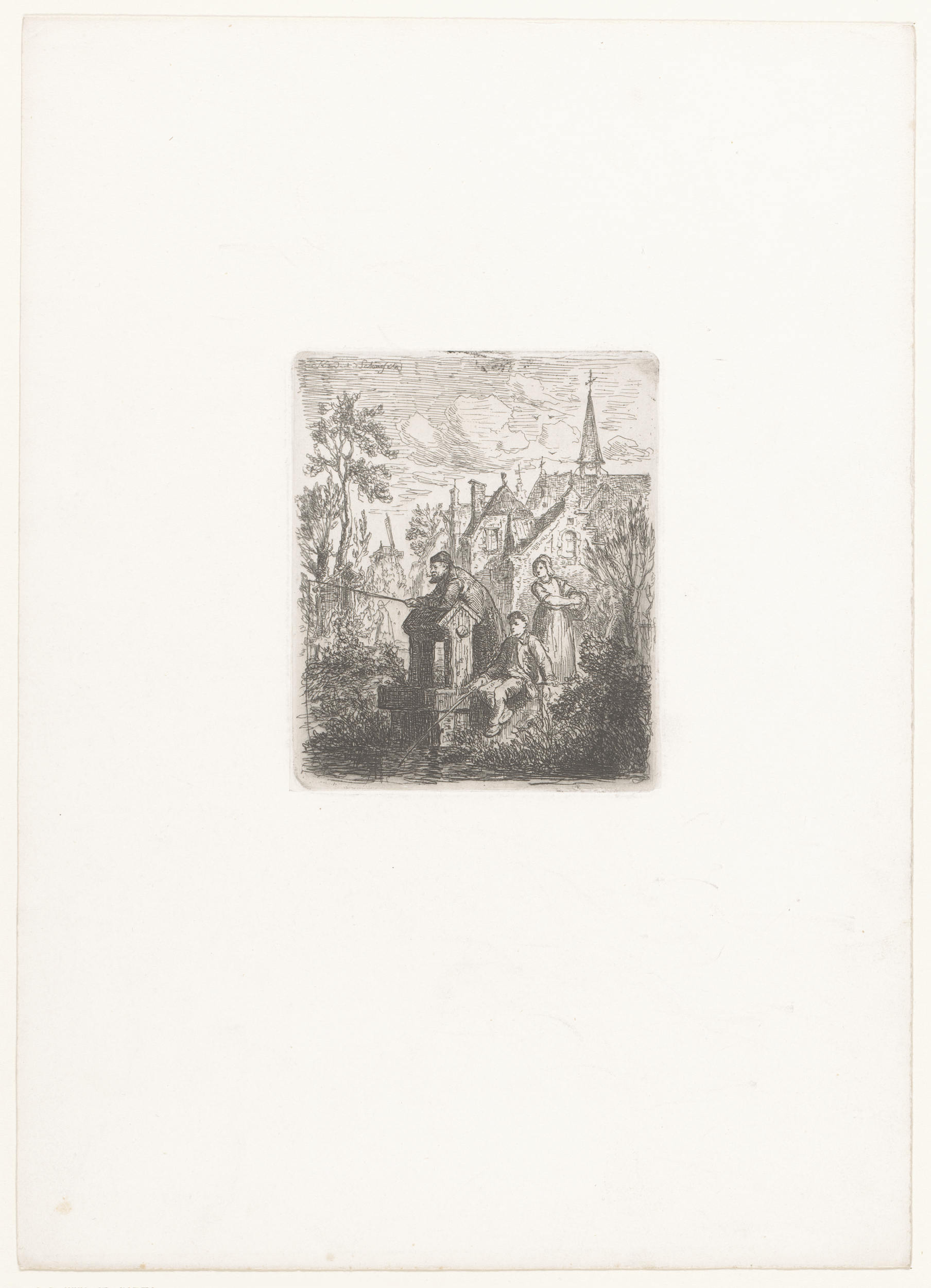 Vissers met hengel aan het water bij een dorp