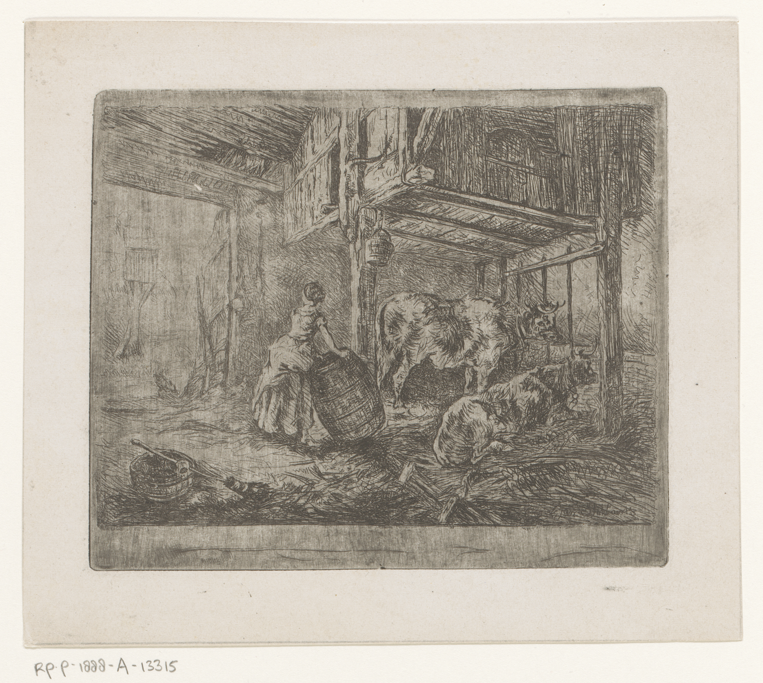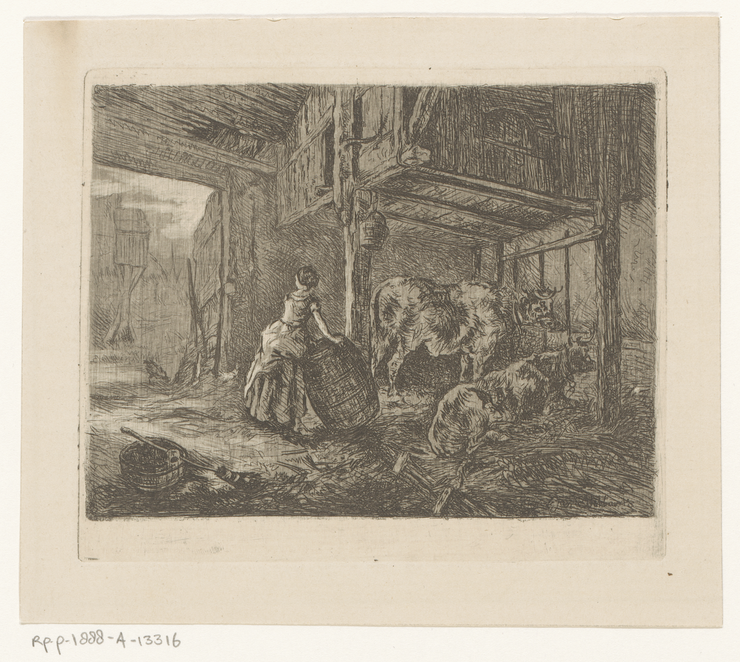 Vrouw met ton in een stal met twee koeien