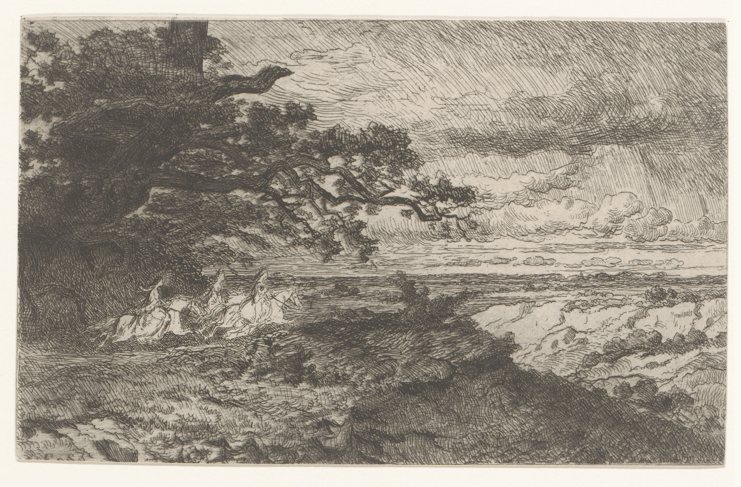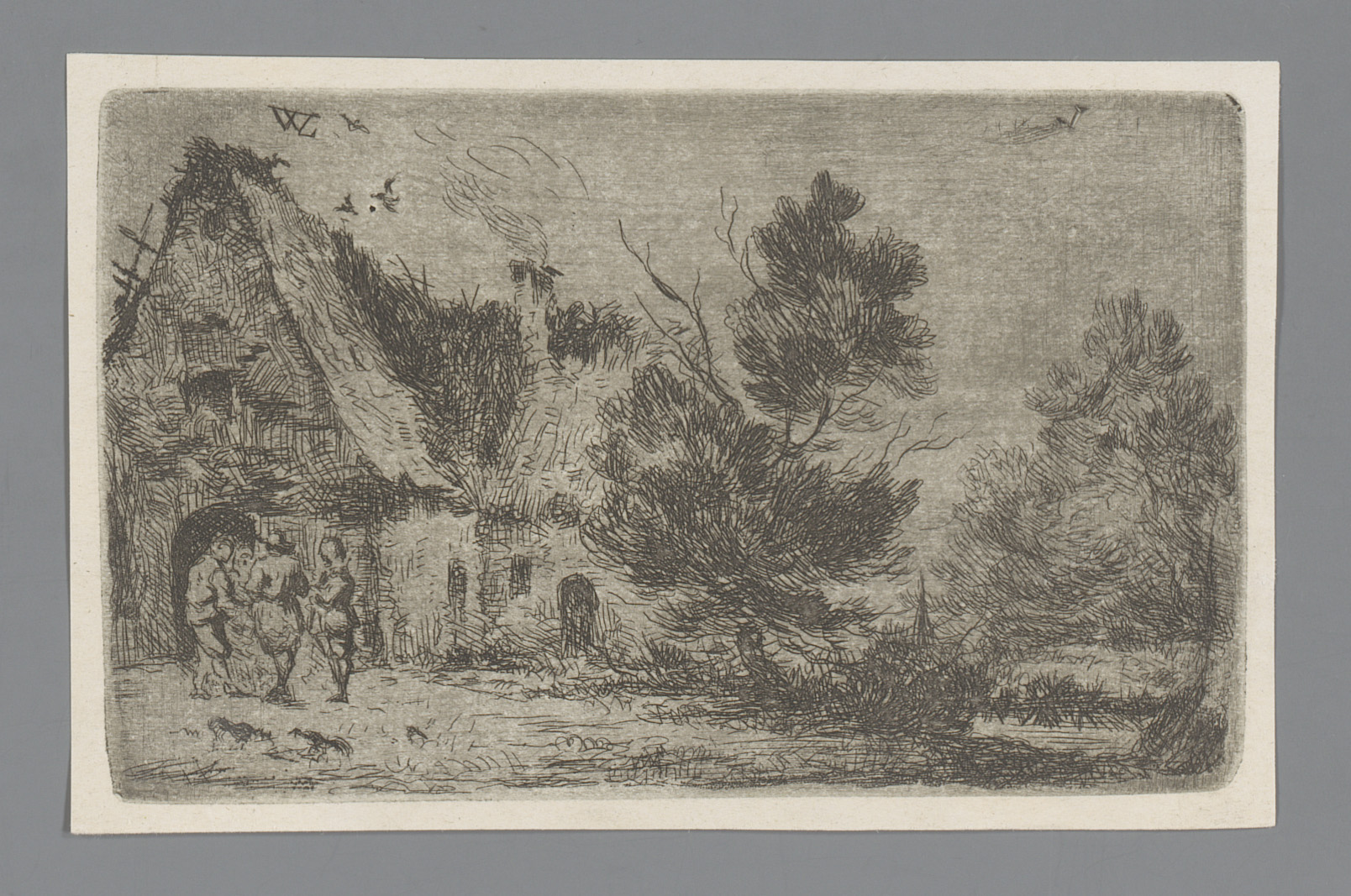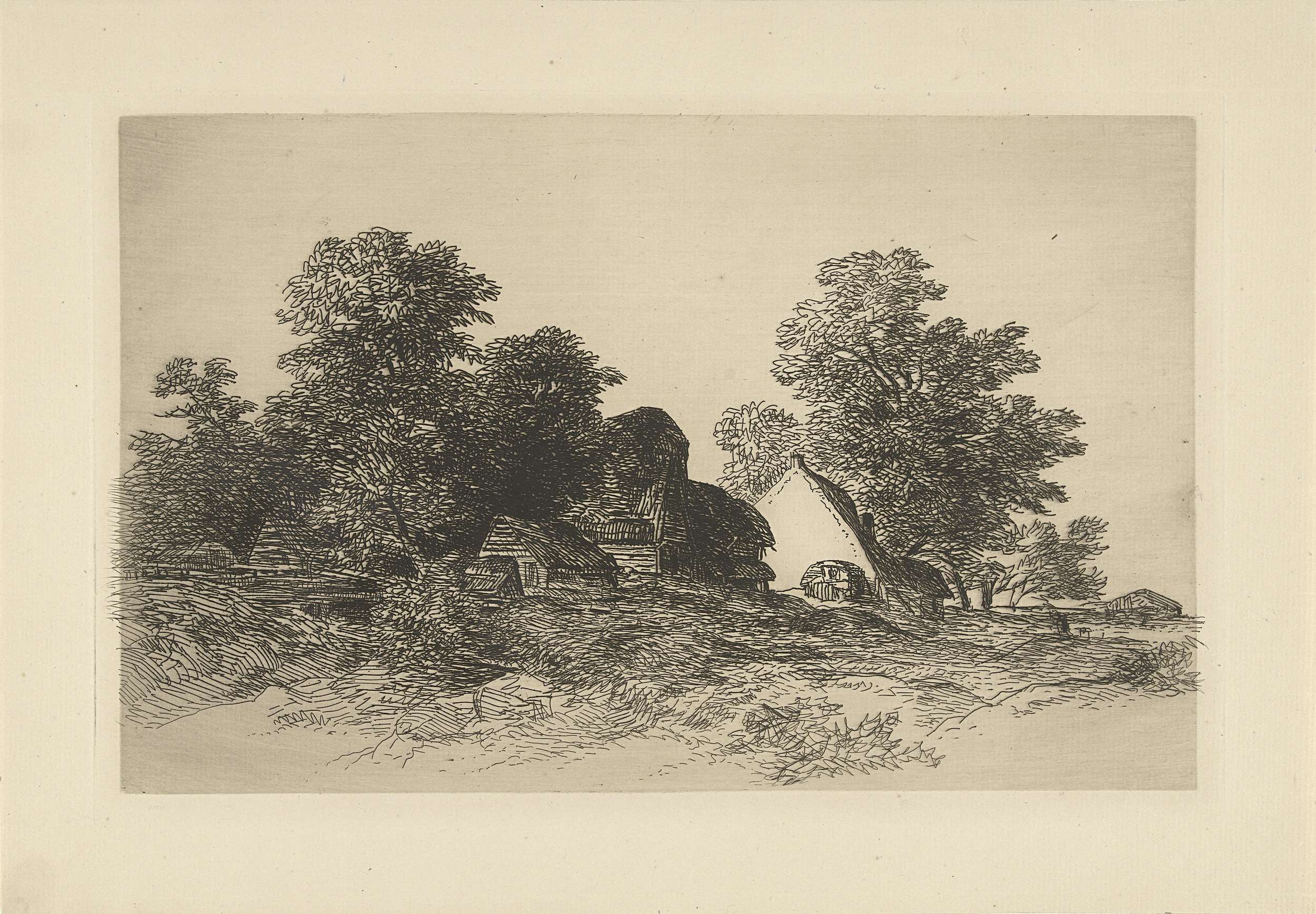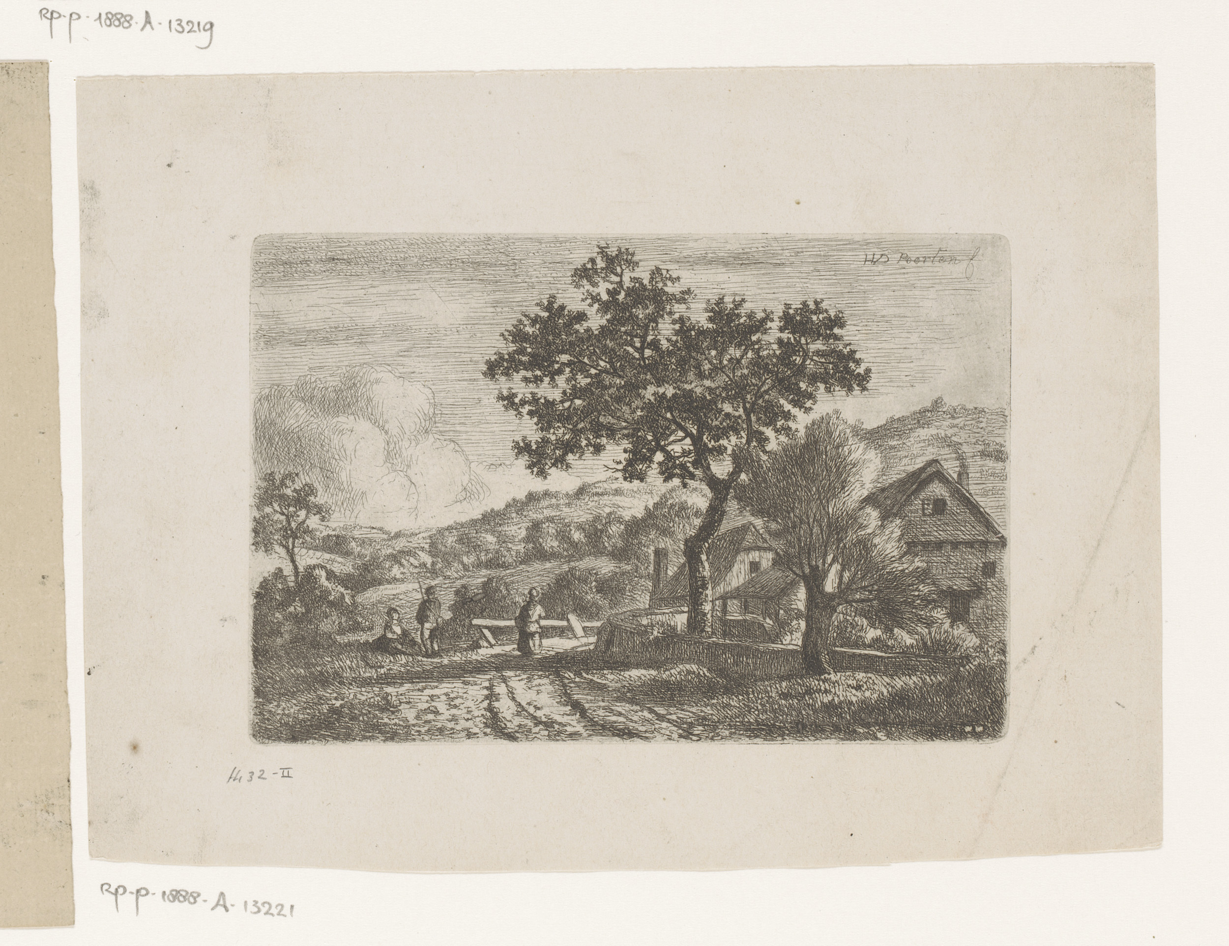 Landschap met vier figuren bij een boerderij