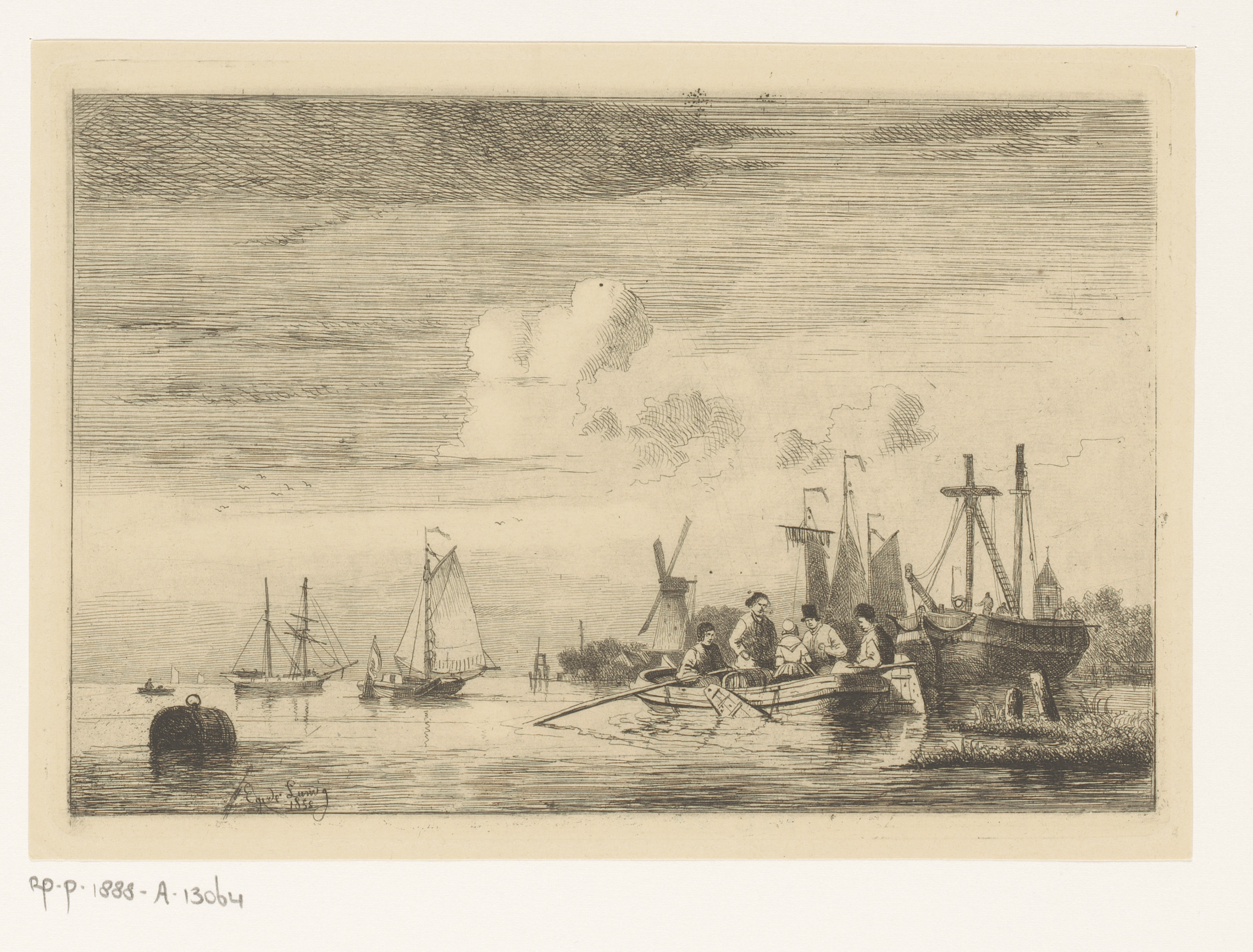 Riviergezicht met drijvende ton, een roeiboot en zei...