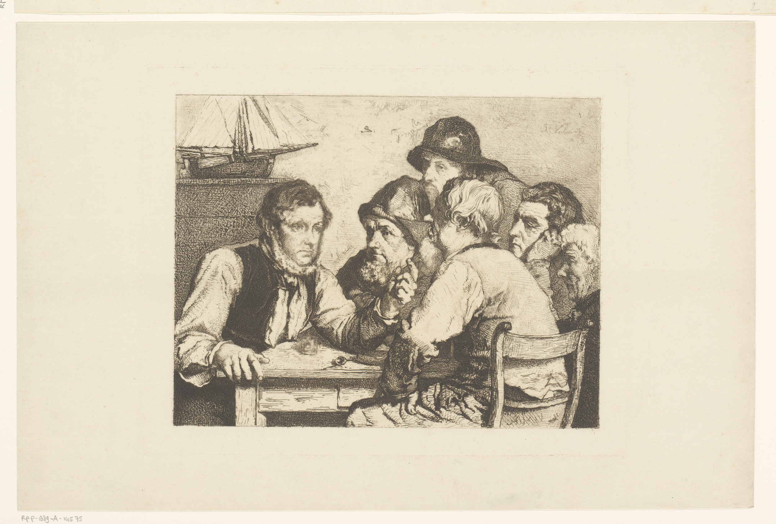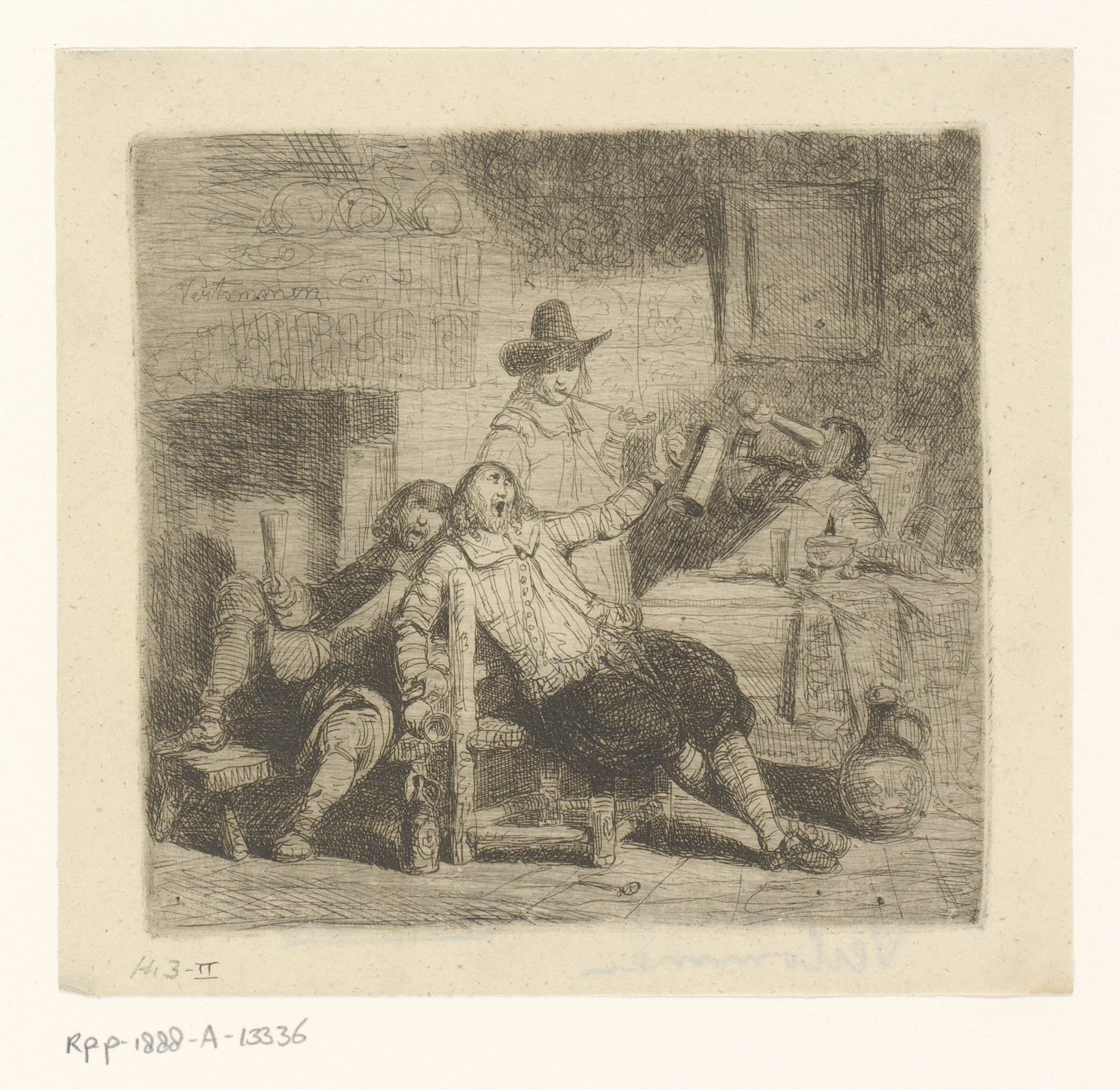 Interieur met vier drinkende mannen