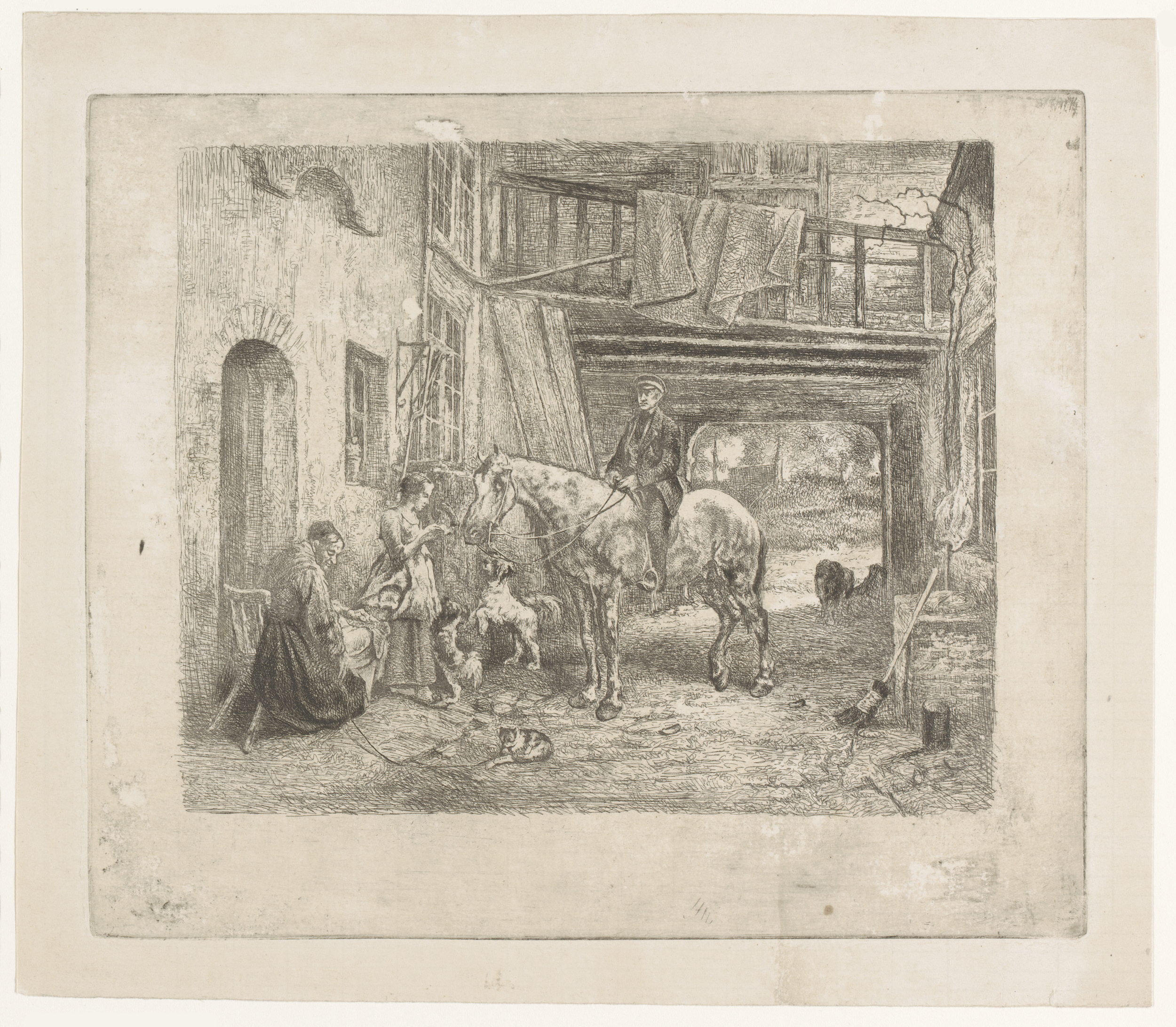 Binnenplaats met man te paard die een brief bezorgt ...