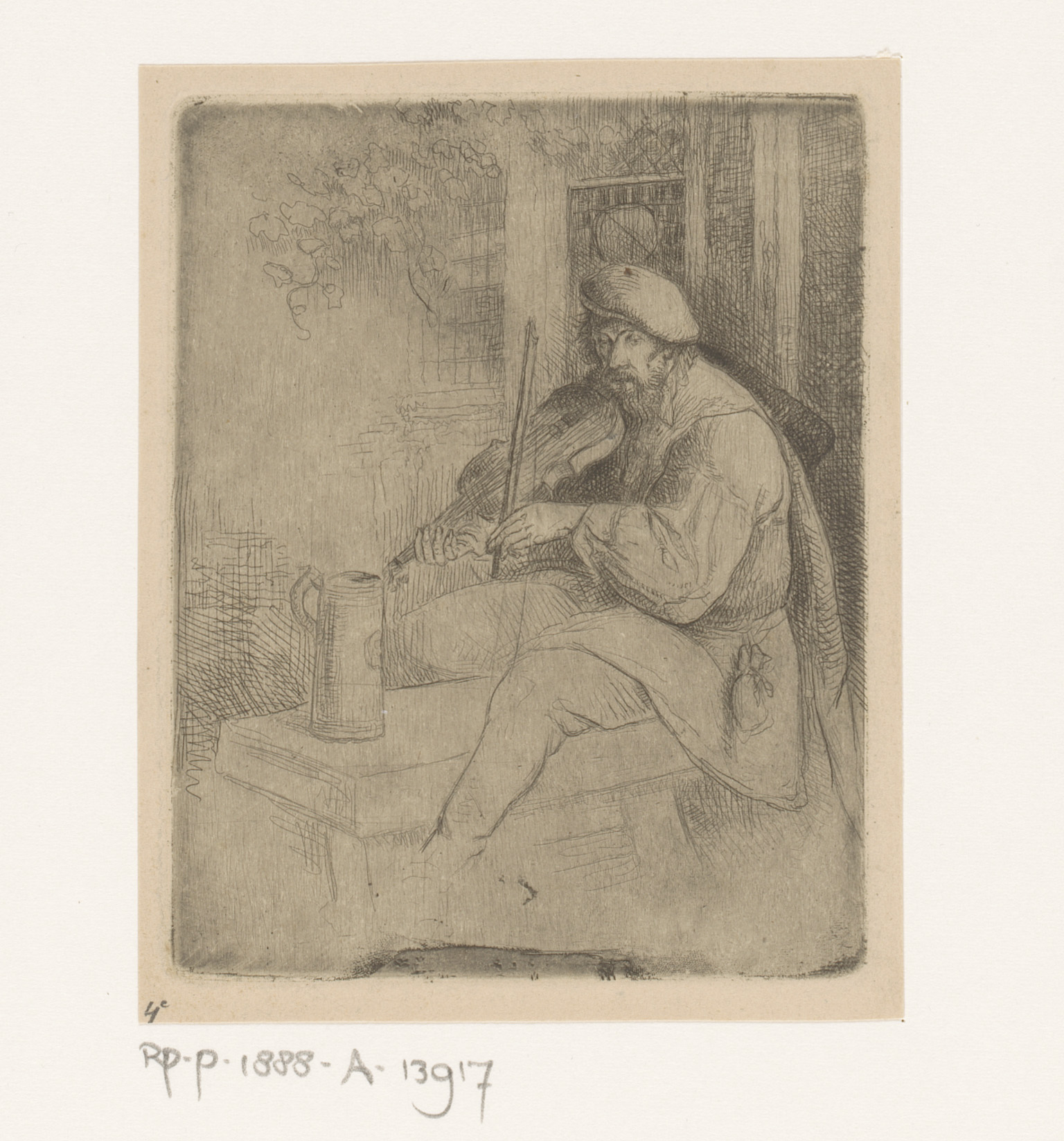 Sater met hoed en trommel bij een muur met vaatwerk