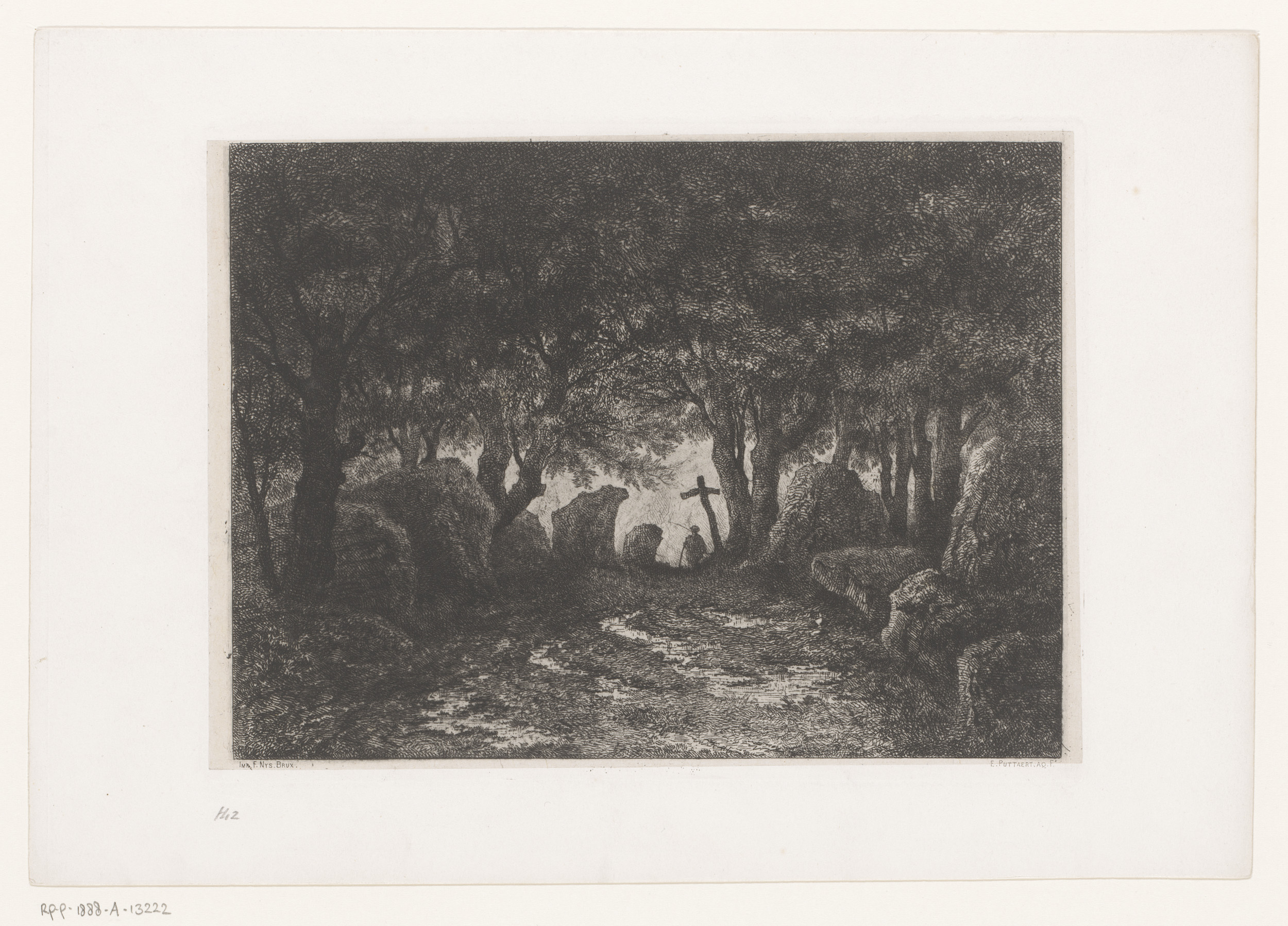 Man bij een houten kruis aan de rand van een bos